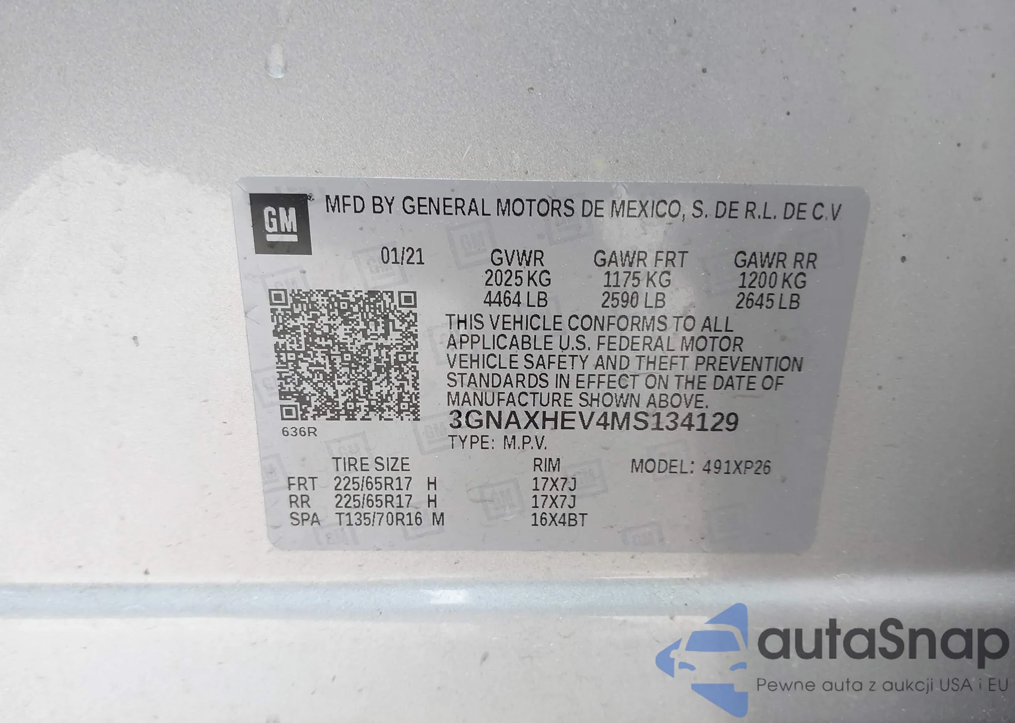 LOT: 42031353 VIN: 3GNAXHEV4MS134129