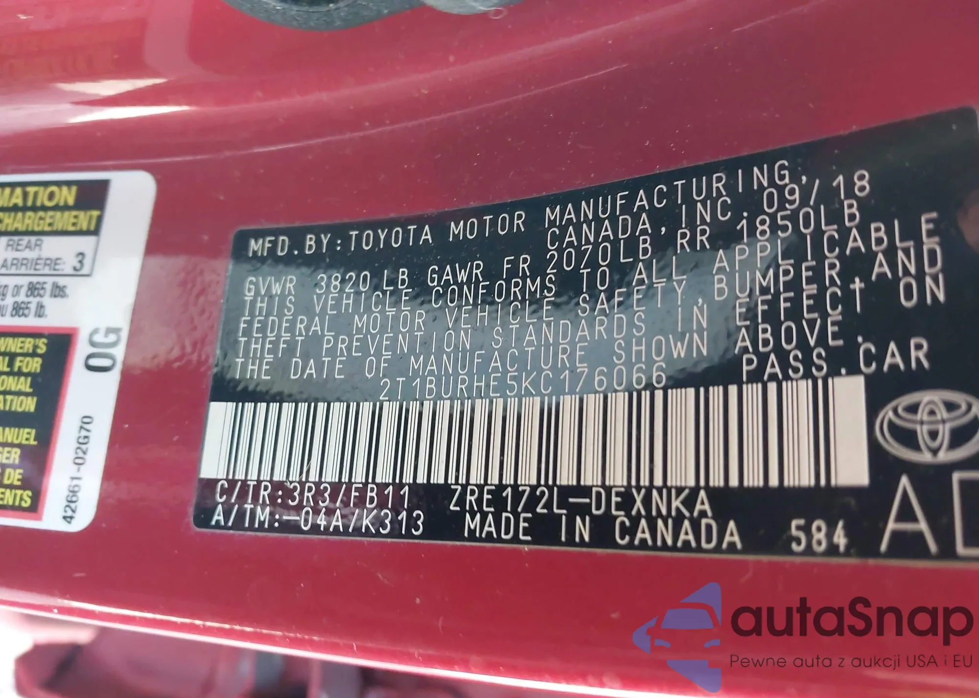 LOT: 41581073 VIN: 2T1BURHE5KC176066