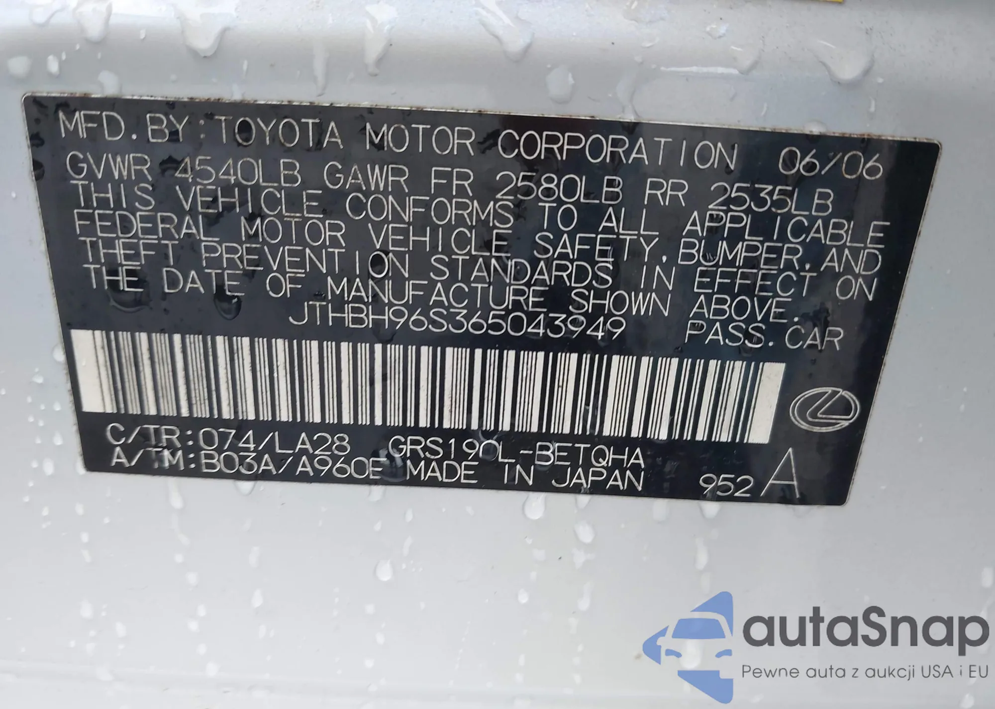 • VIN JTHBH96S365043949