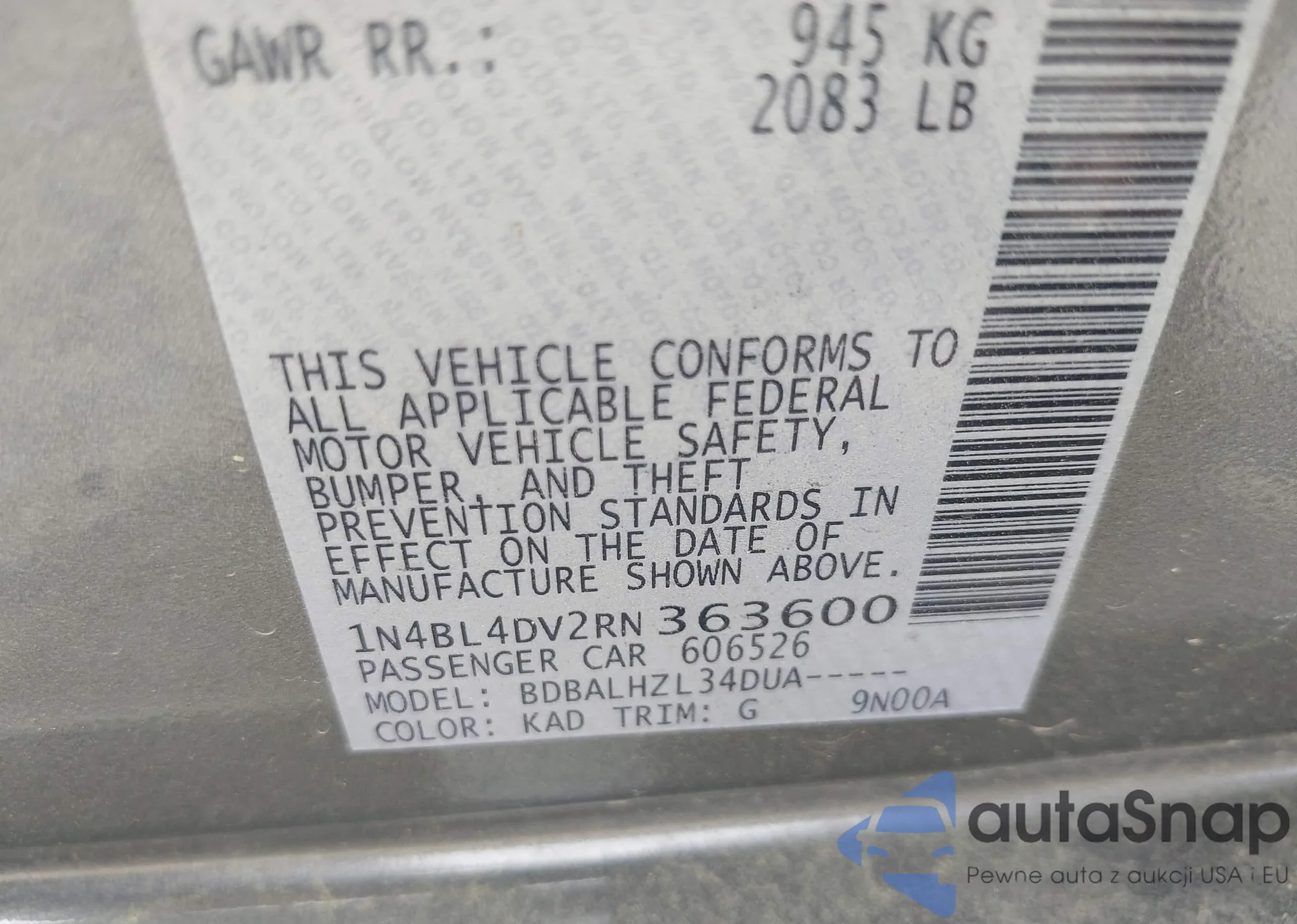 • VIN 1N4BL4DV2RN363600