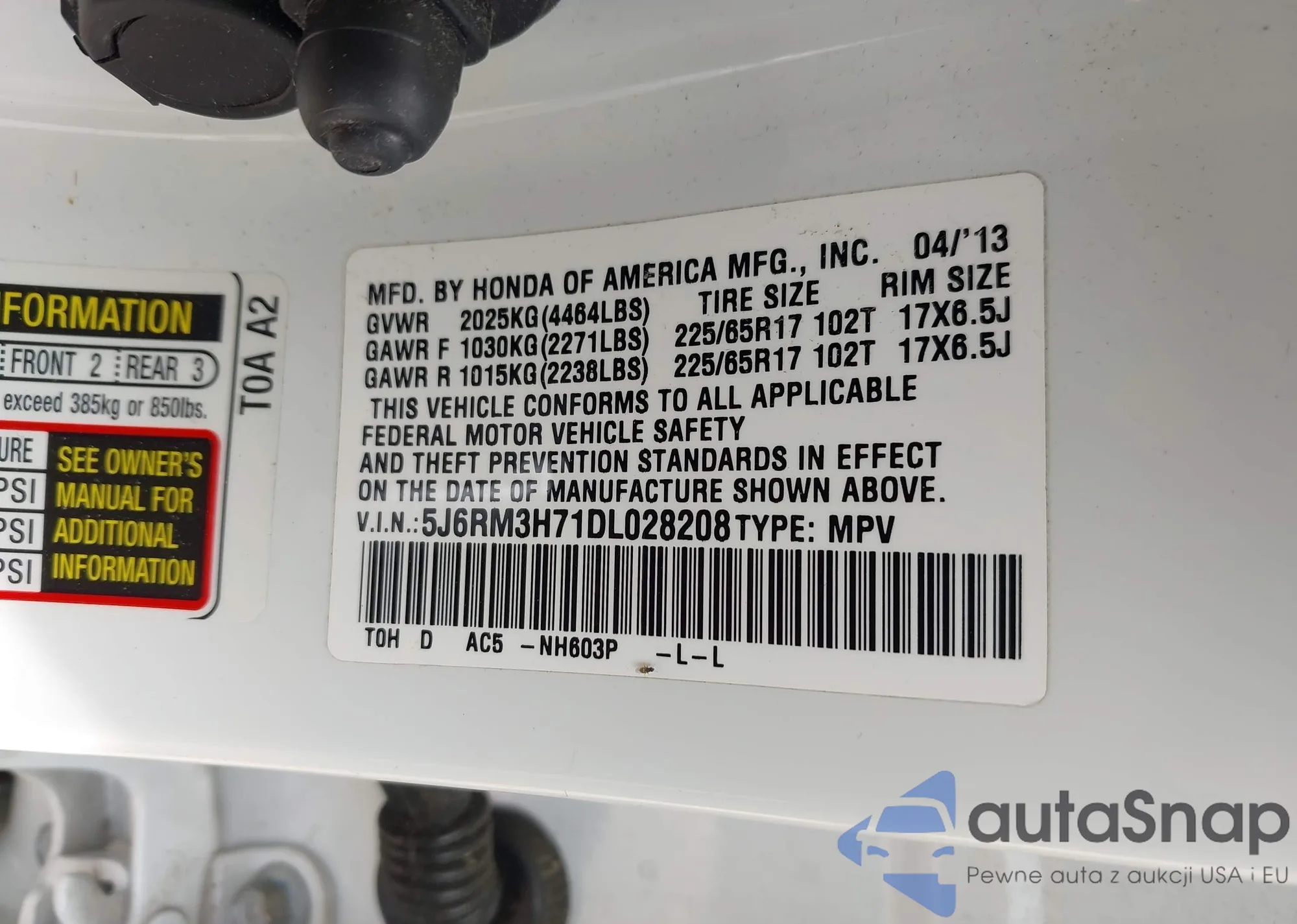 • VIN 5J6RM3H71DL028208