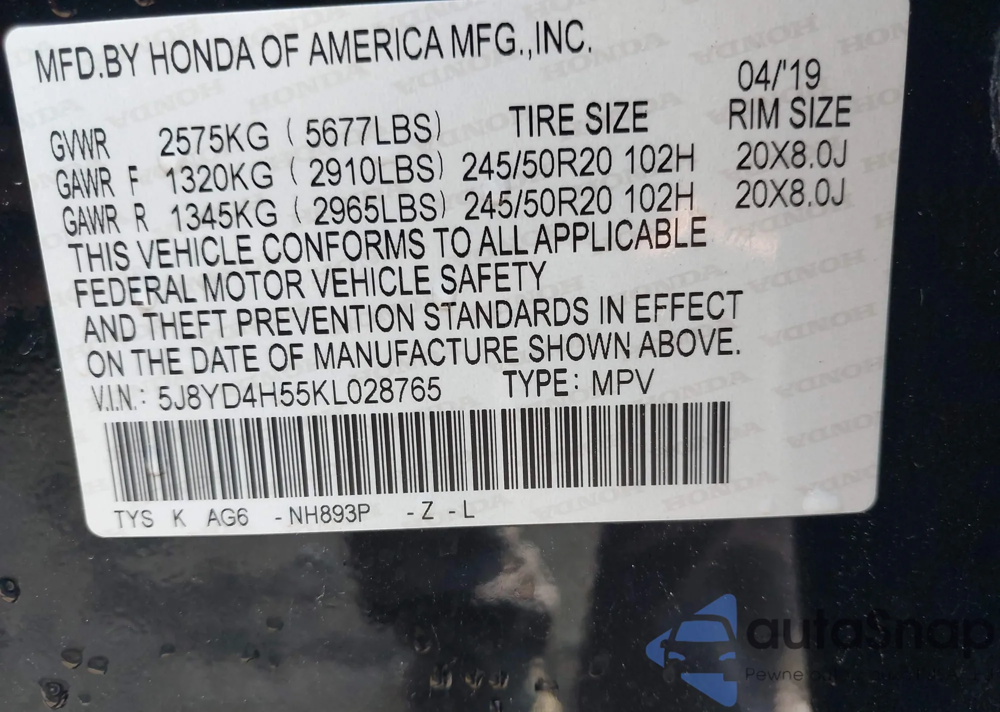• VIN 5J8YD4H55KL028765