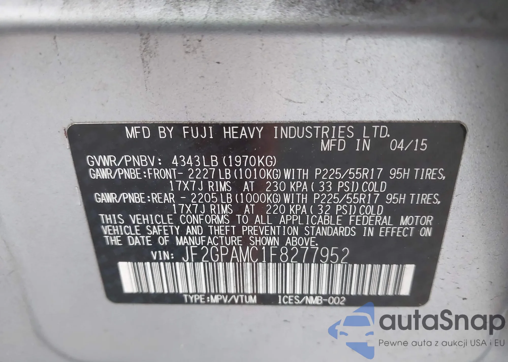 LOT: 42197747 VIN: JF2GPAMC1F8277952