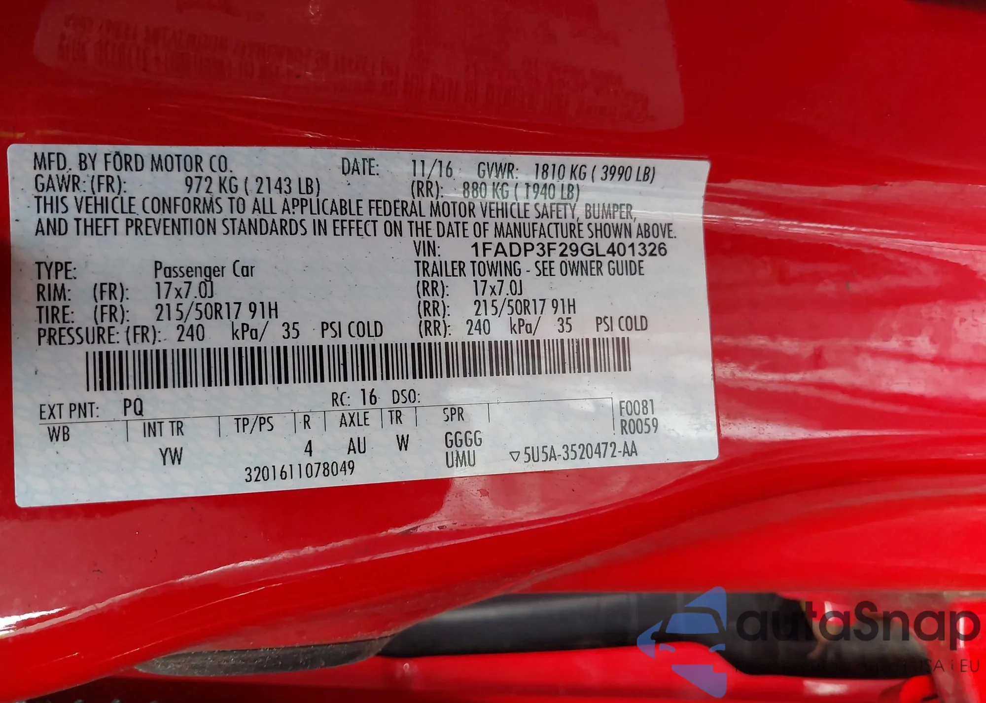 • VIN 1FADP3F29GL401326