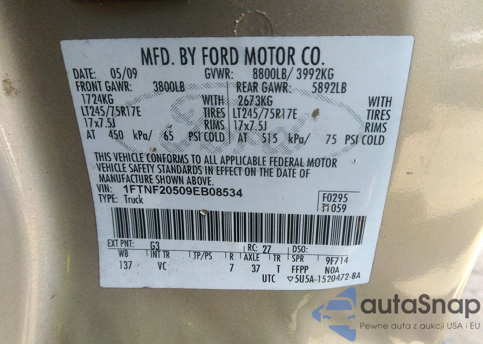 LOT: 42289396 VIN: 1FTNF20509EB08534