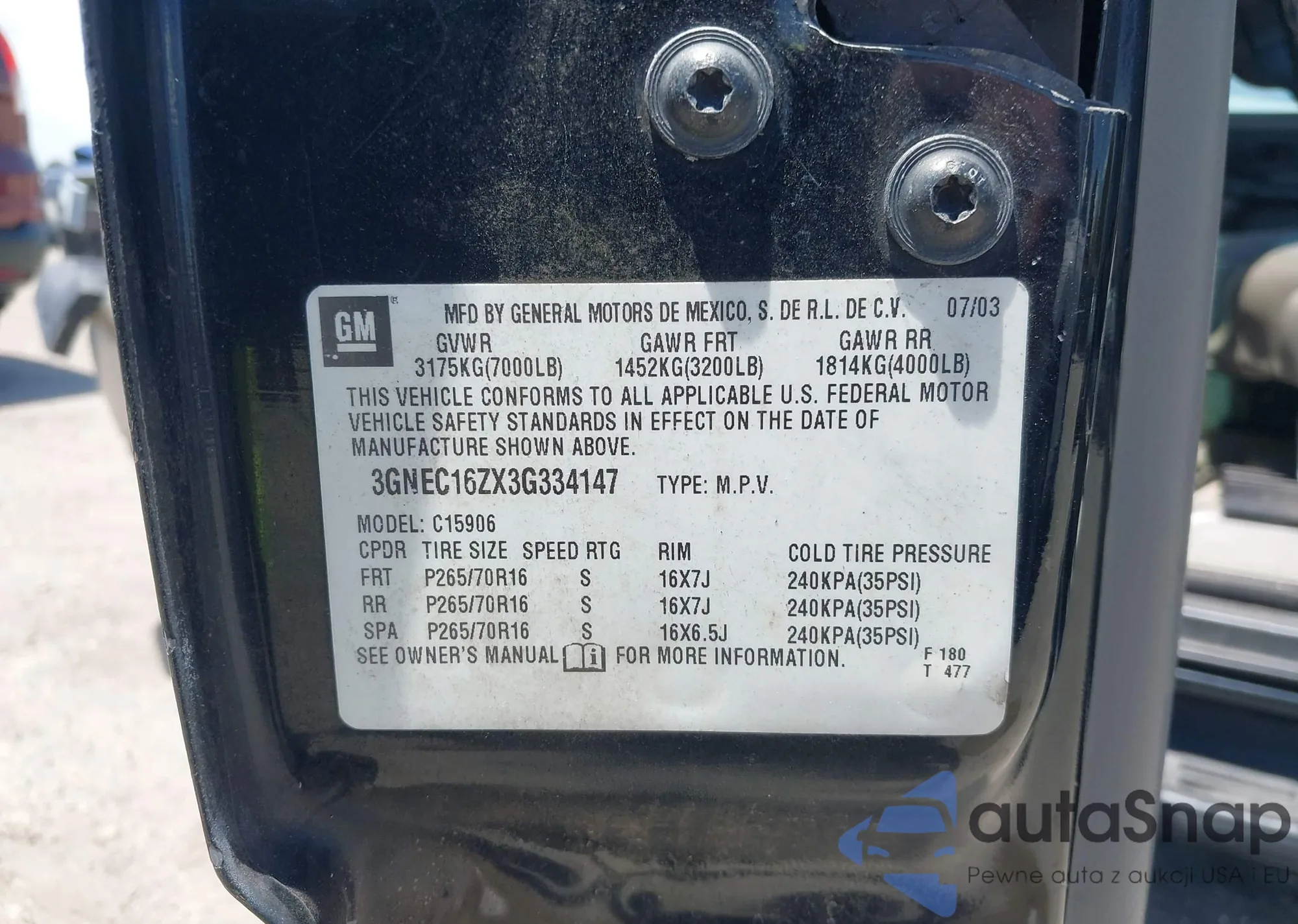 • VIN 3GNEC16ZX3G334147