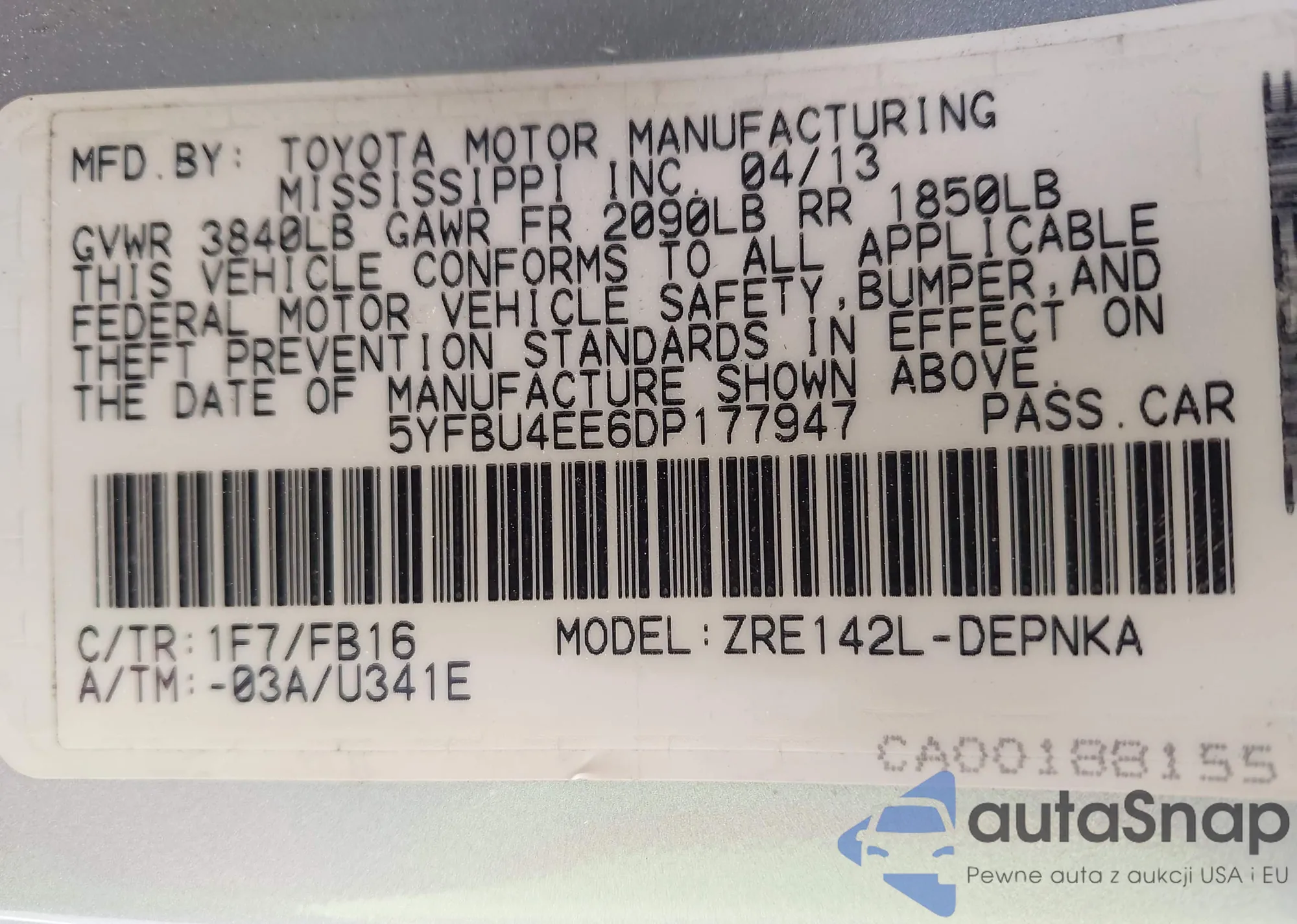 LOT: 42038861 VIN: 5YFBU4EE6DP177947