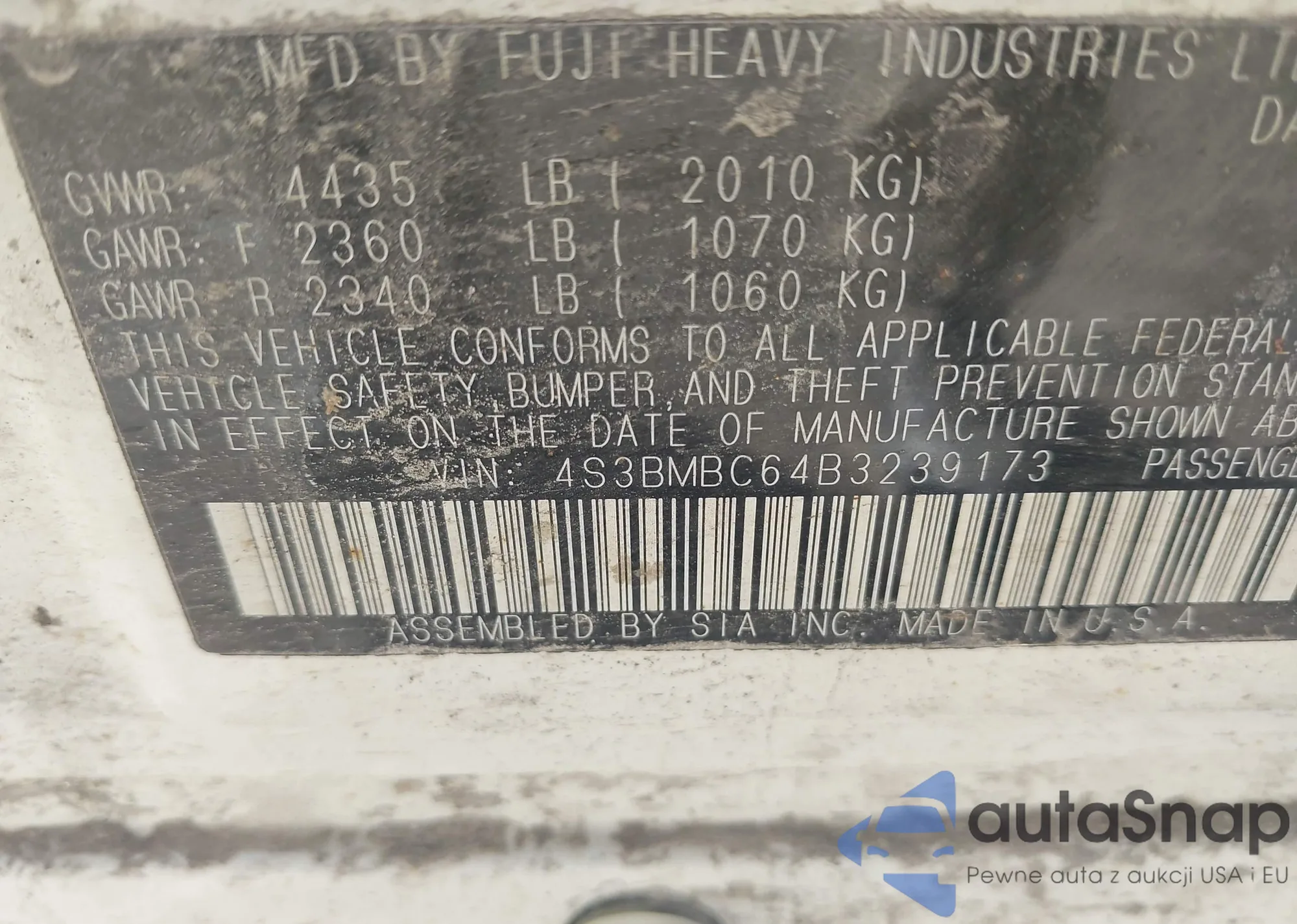 LOT: 42056233 VIN: 4S3BMBC64B3239173