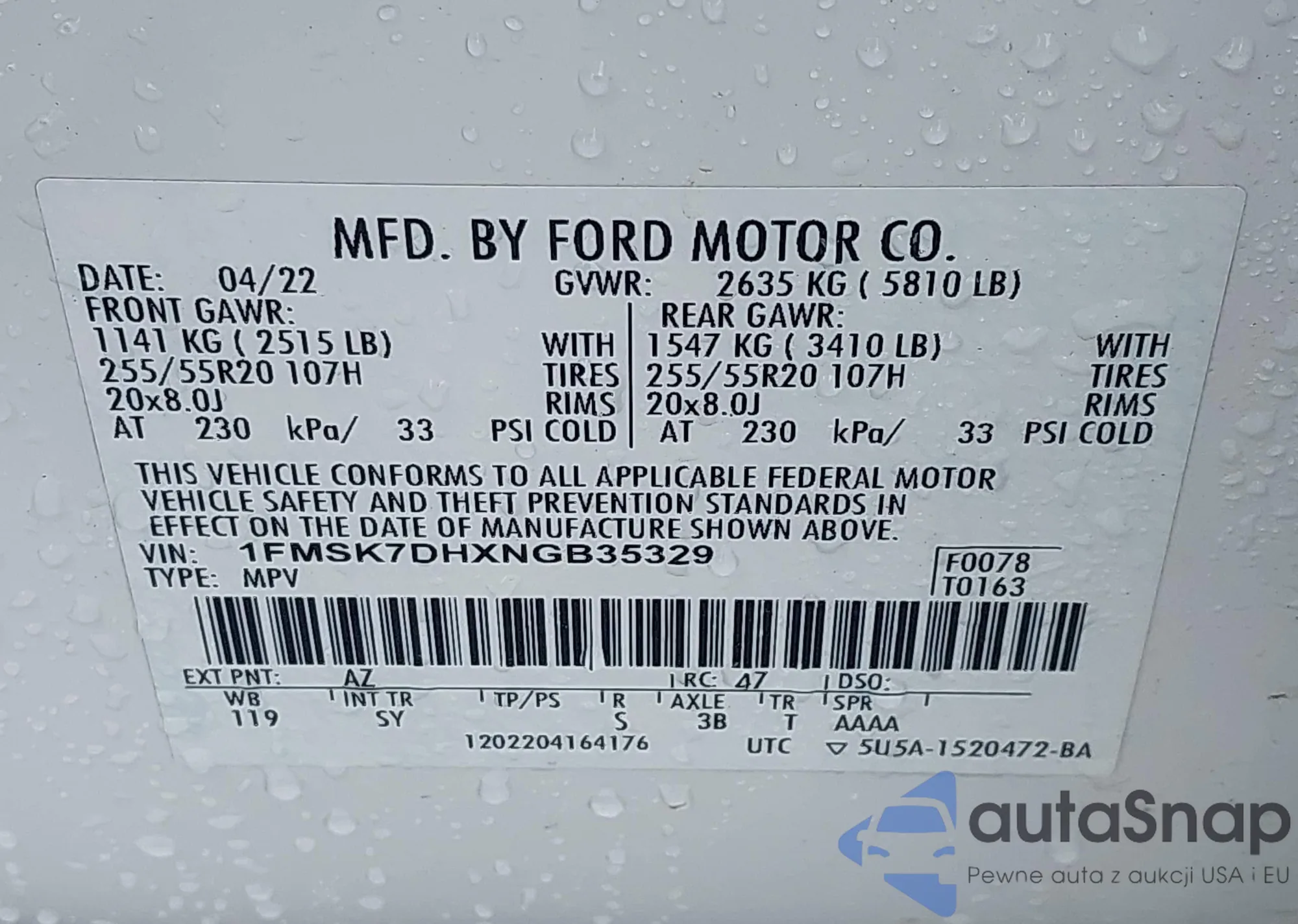 LOT: 42221442 VIN: 1FMSK7DHXNGB35329