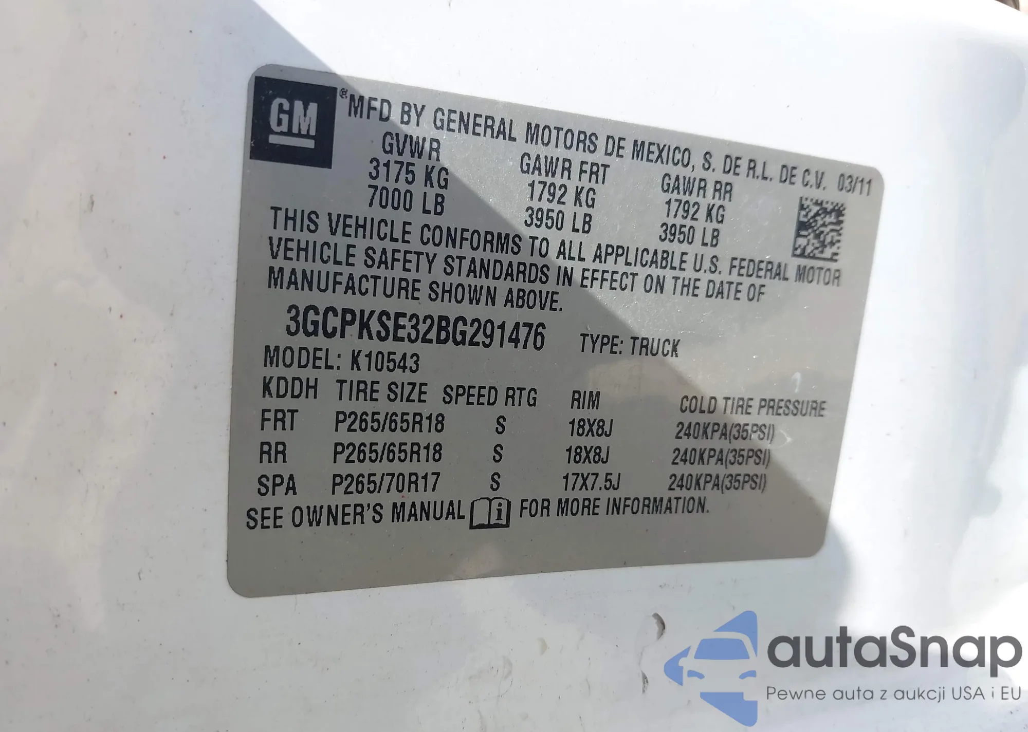 • VIN 3GCPKSE32BG291476