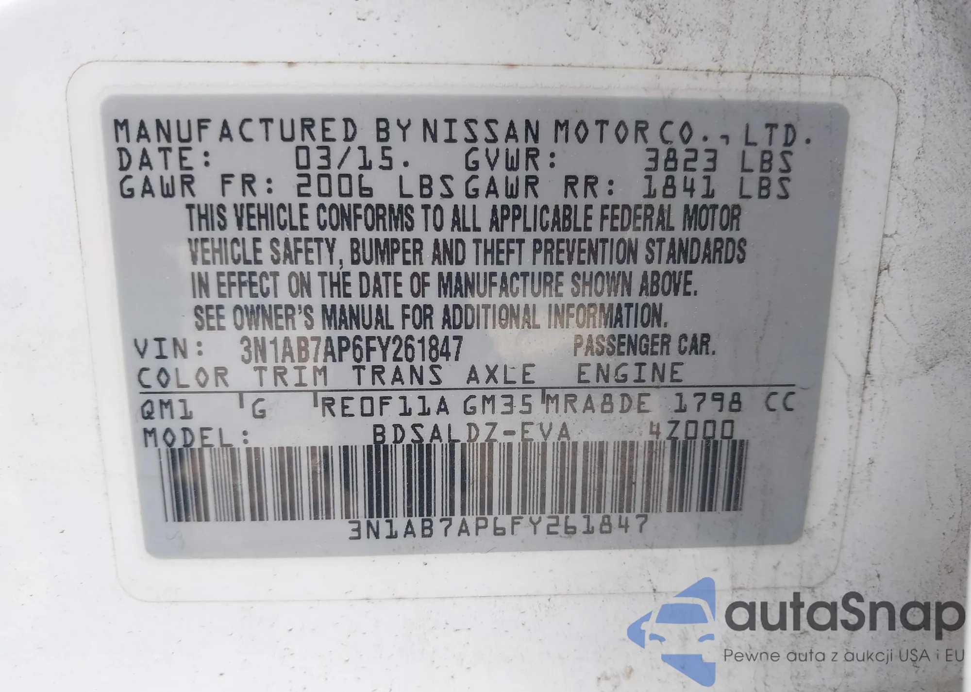 LOT: 42387539 VIN: 3N1AB7AP6FY261847