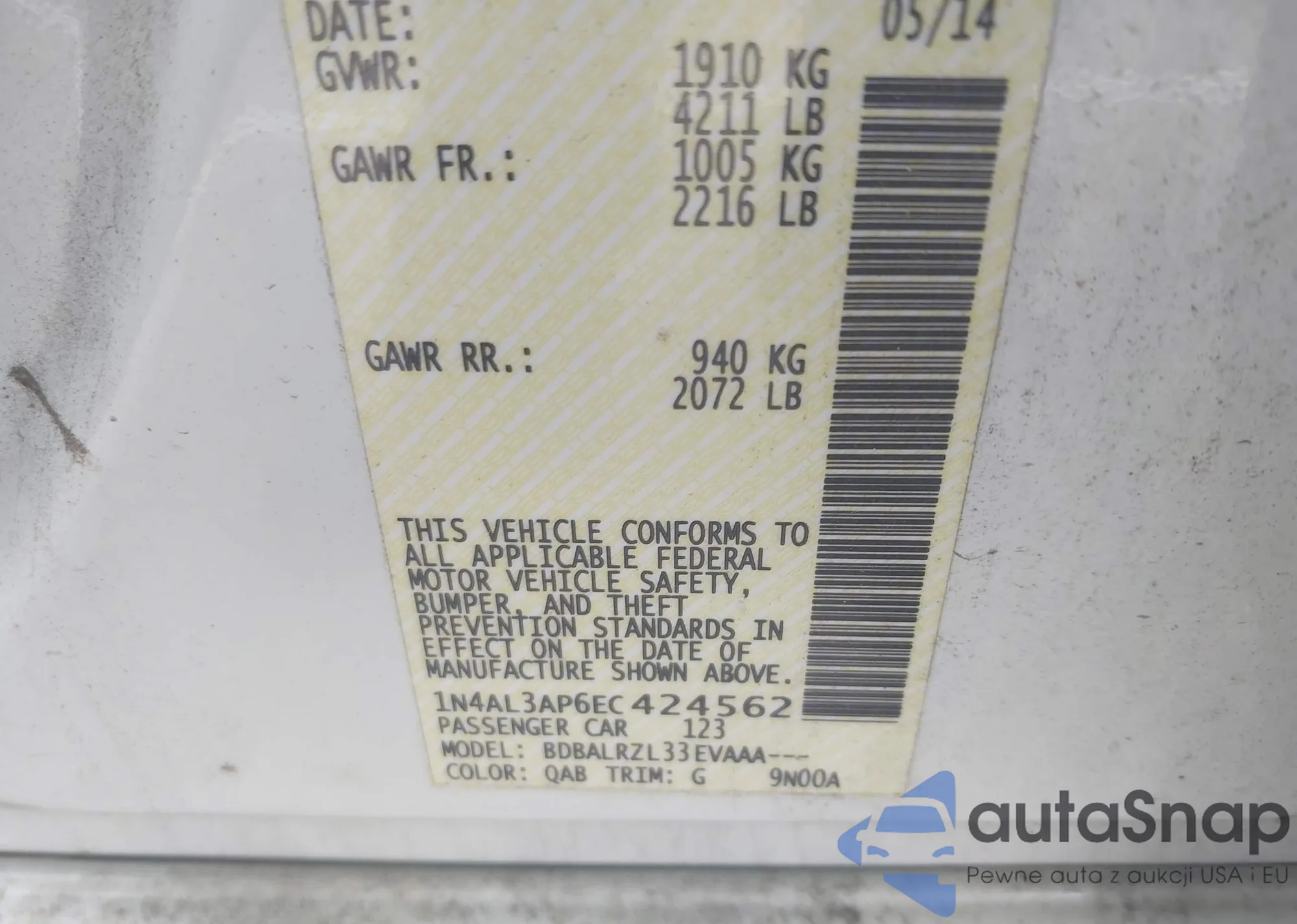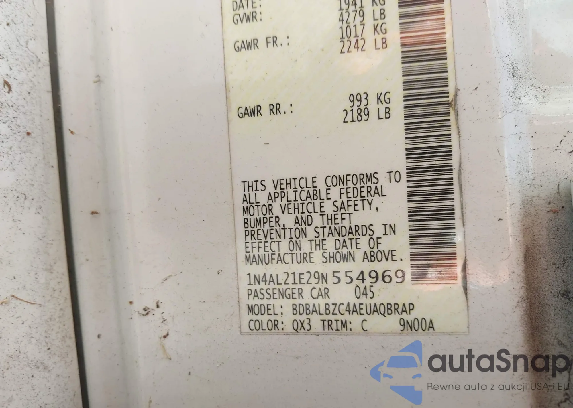 LOT: 42198316 VIN: 1N4AL21E29N554969