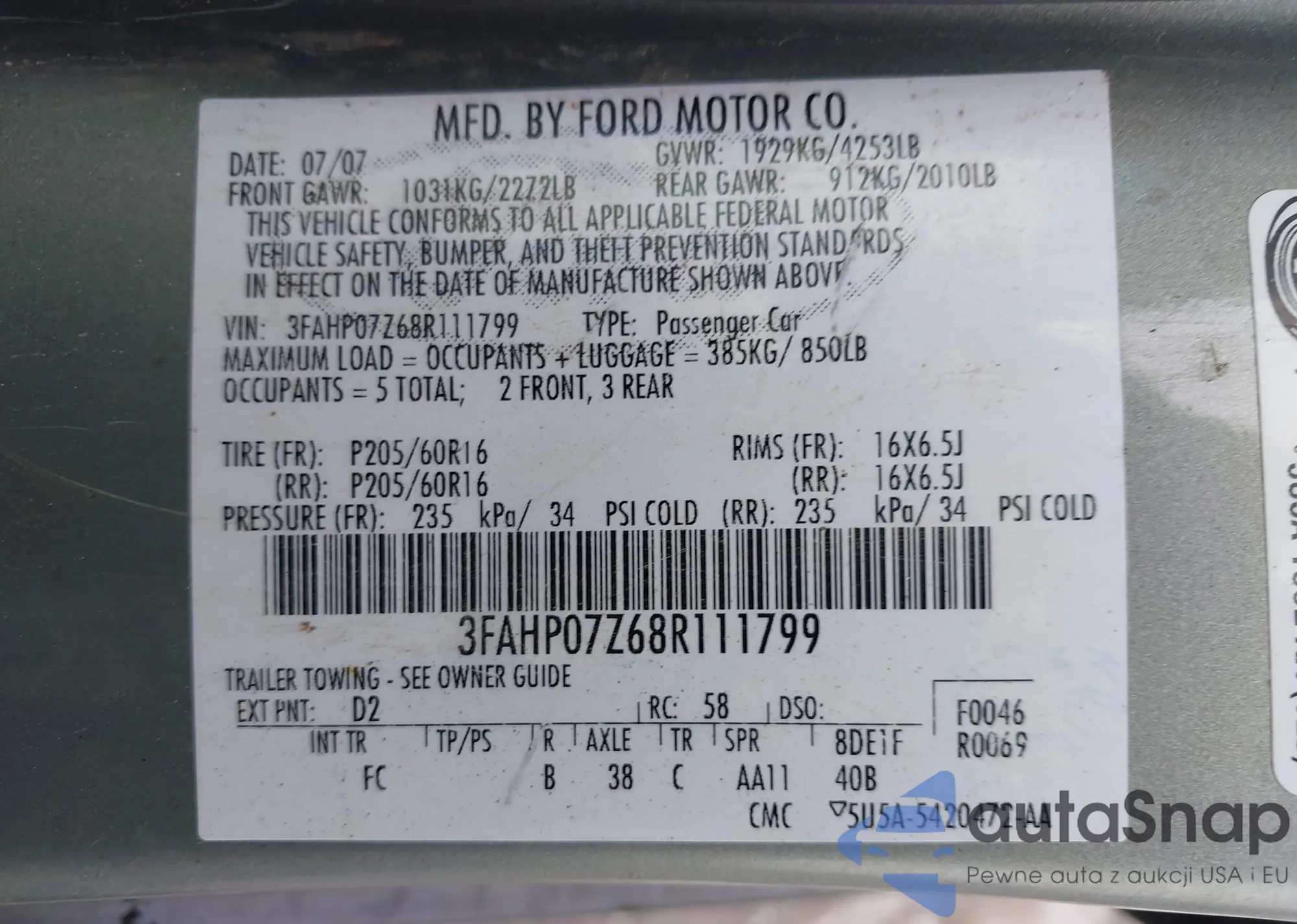 • VIN 3FAHP07Z68R111799