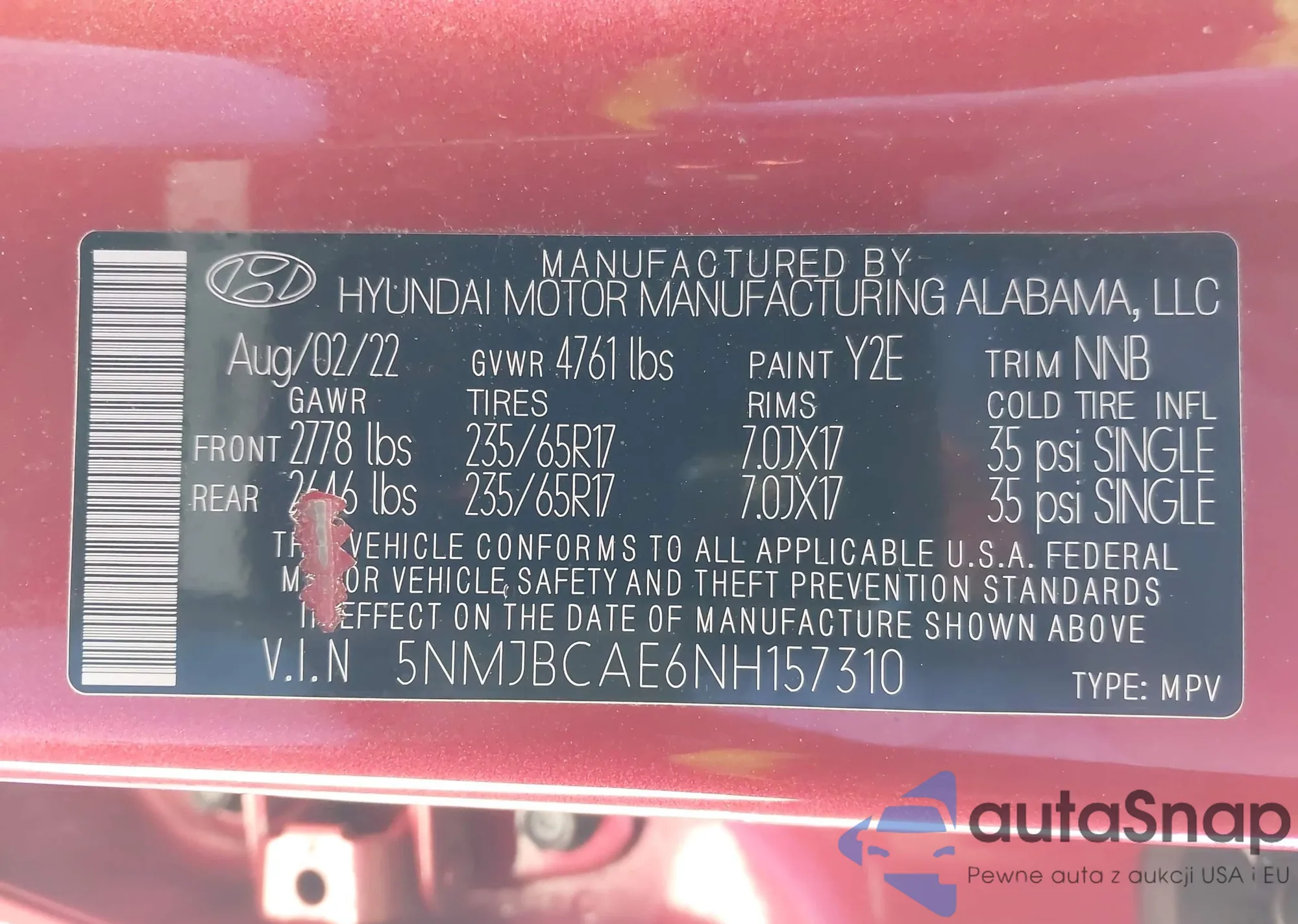 • VIN 5NMJBCAE6NH157310