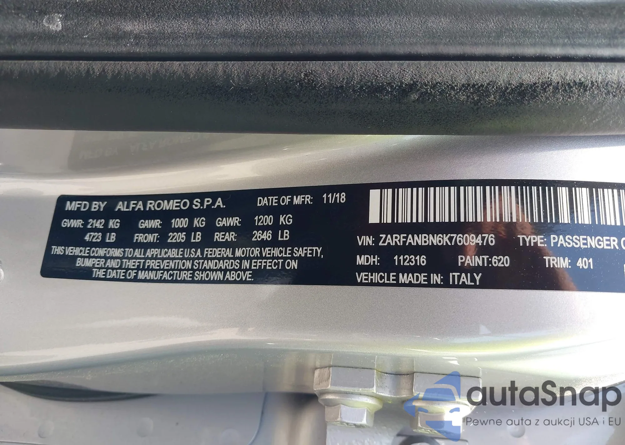 LOT: 42343594 VIN: ZARFANBN6K7609476
