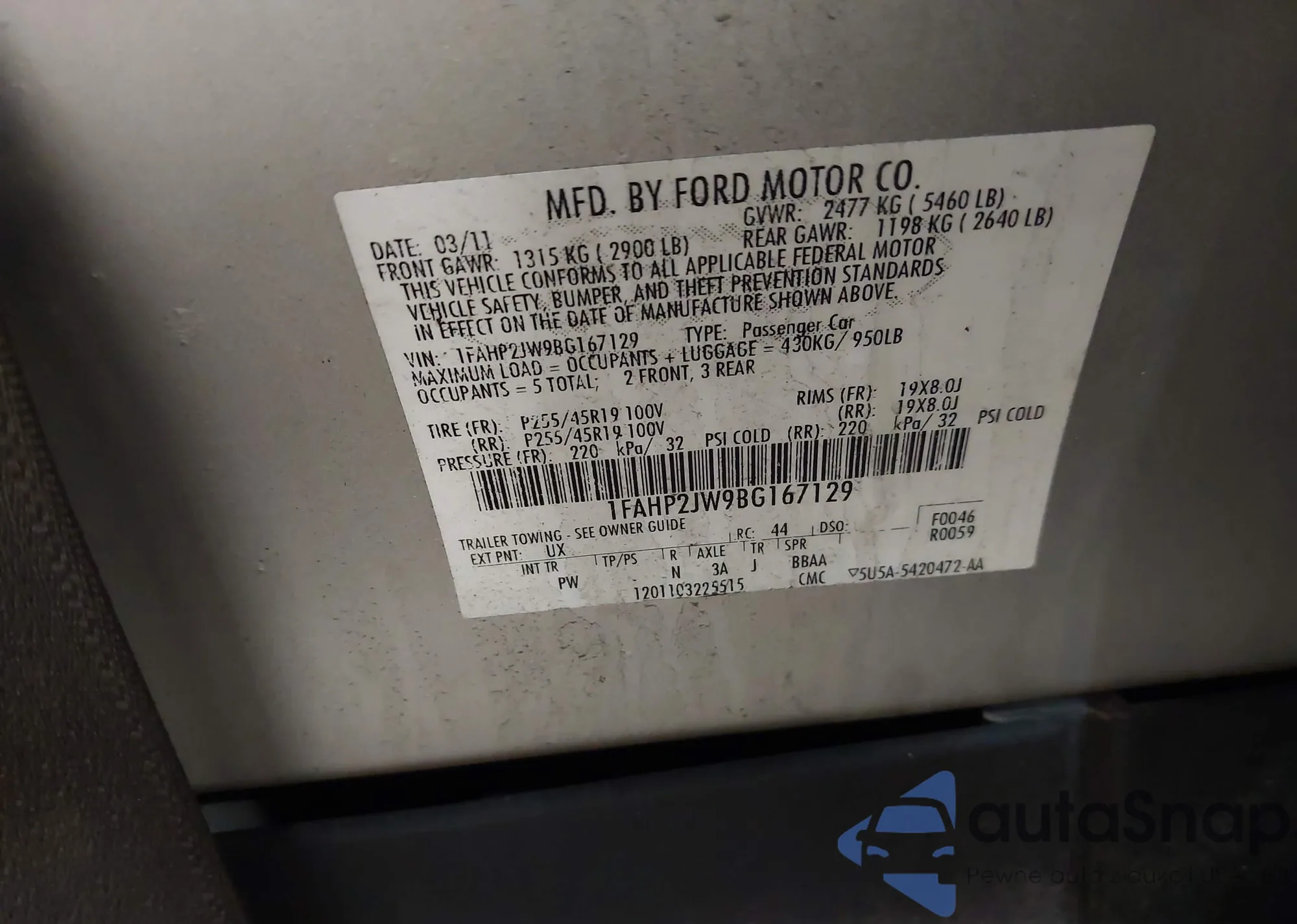 LOT: 42206160 VIN: 1FAHP2JW9BG167129