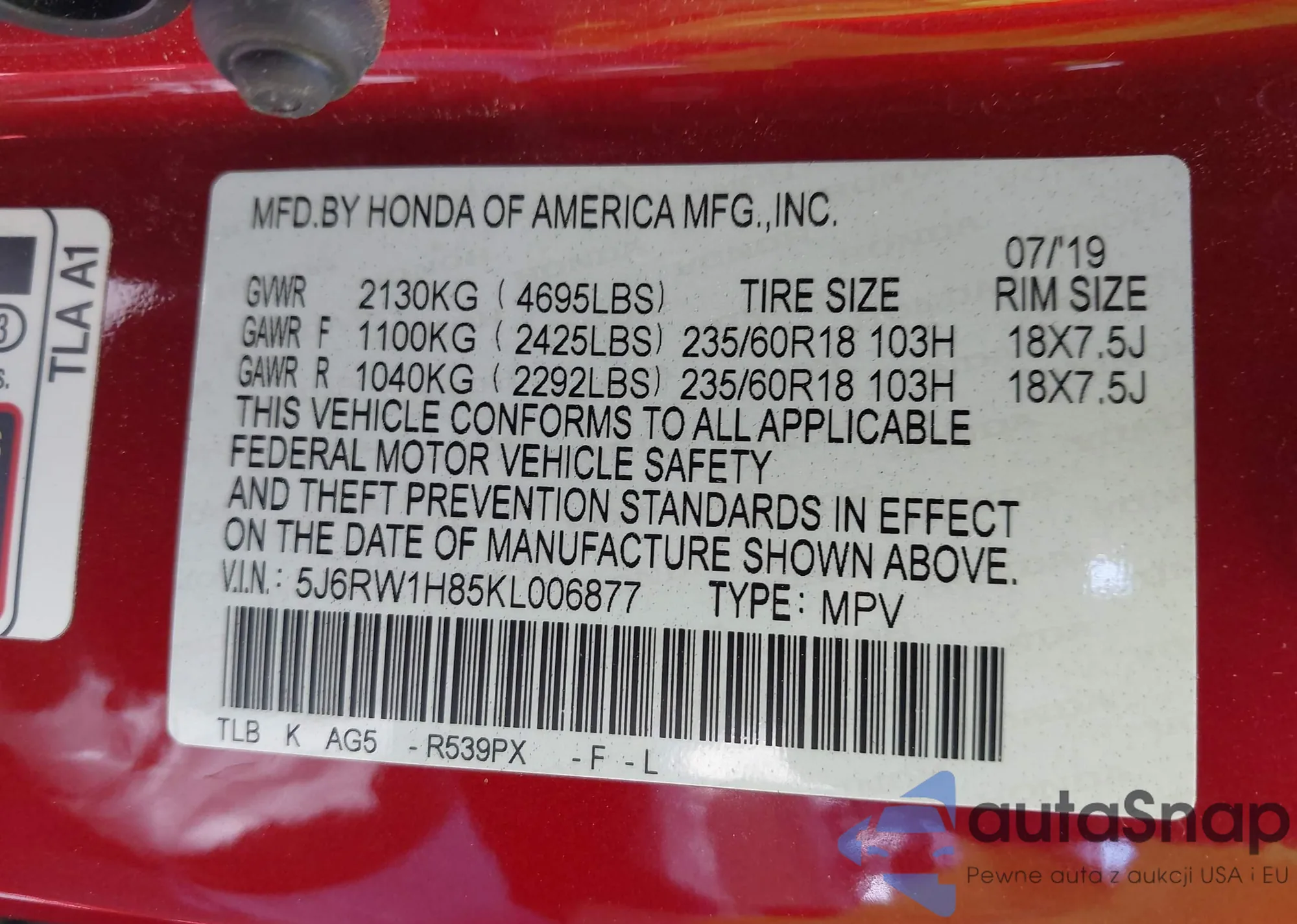 • VIN 5J6RW1H85KL006877