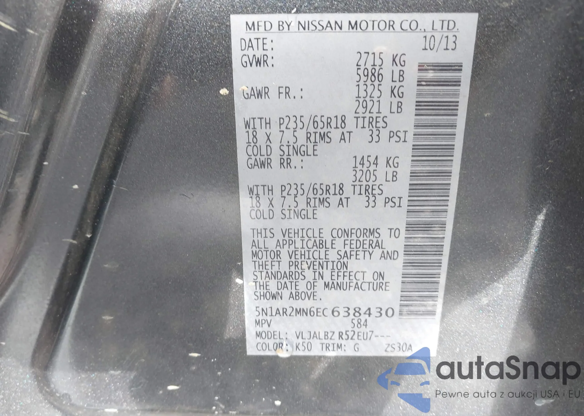 LOT: 42326218 VIN: 5N1AR2MN6EC638430