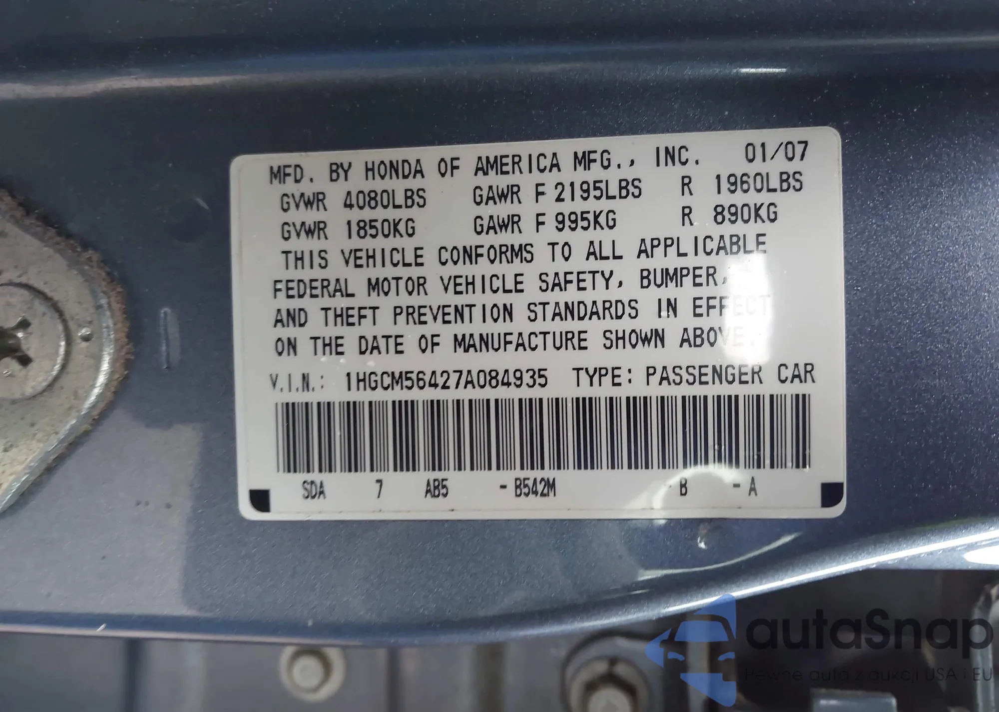 LOT: 42351406 VIN: 1HGCM56427A084935