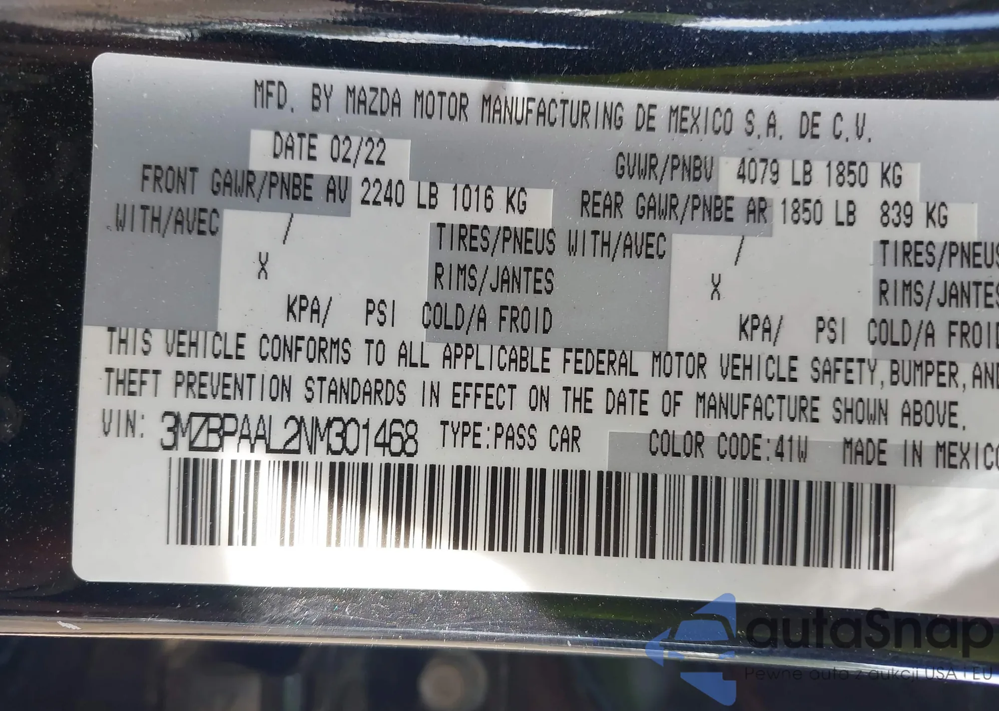 LOT: 42181416 VIN: 3MZBPAAL2NM301468