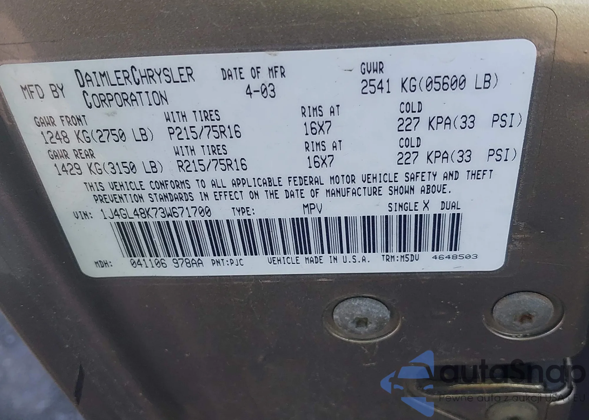 LOT: 42222189 VIN: 1J4GL48K73W671700
