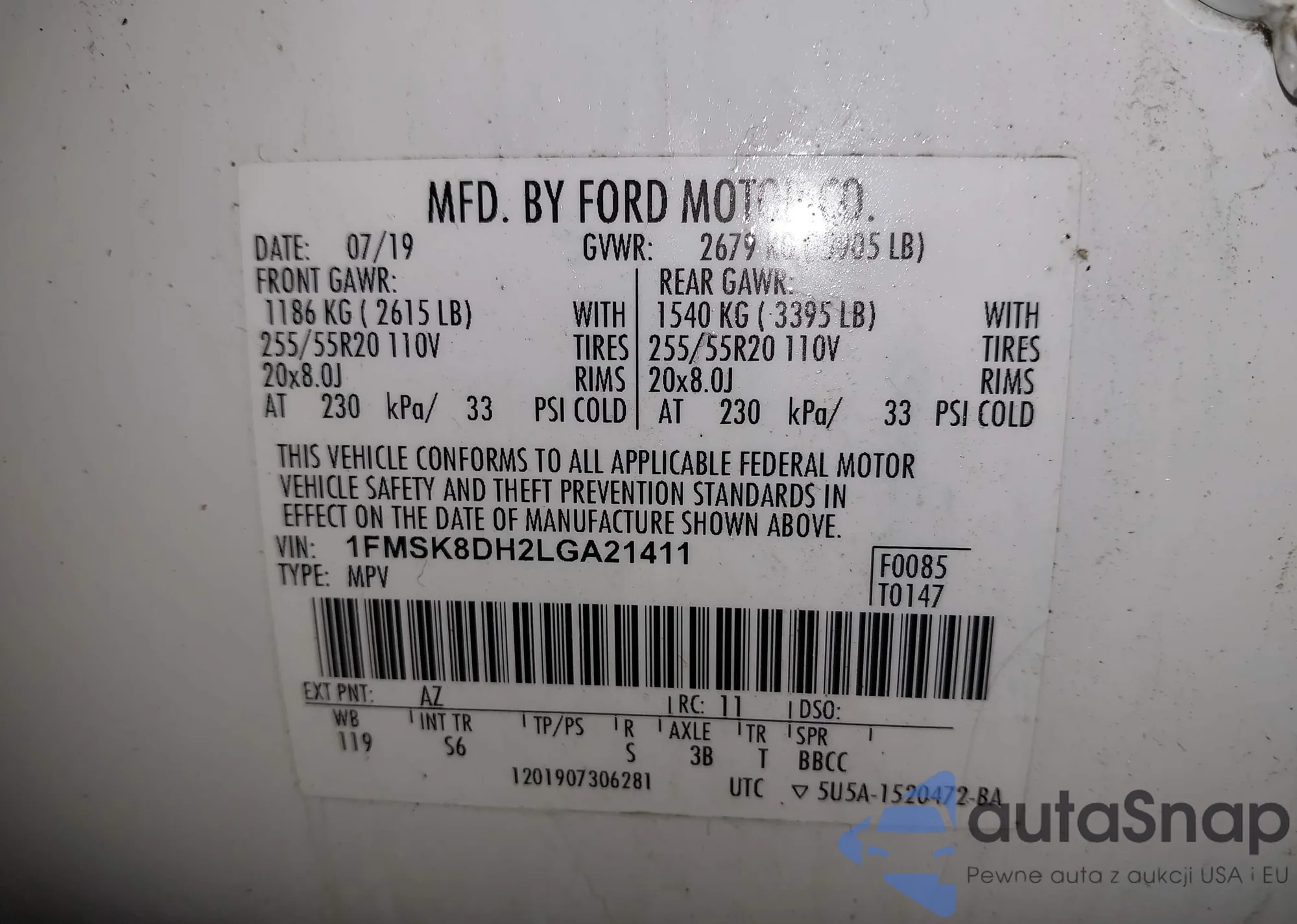 LOT: 41605079 VIN: 1FMSK8DH2LGA21411
