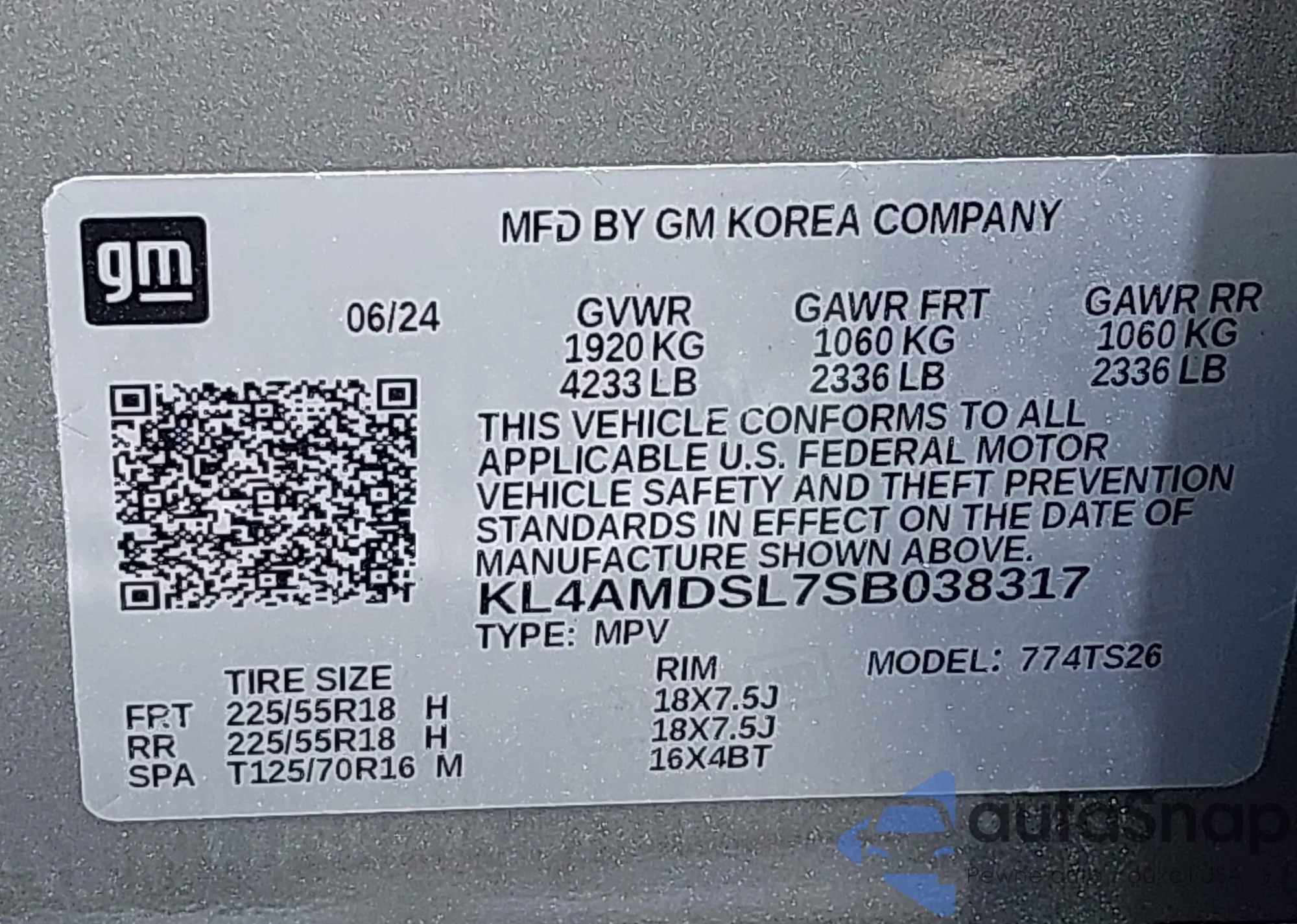 • VIN KL4AMDSL7SB038317