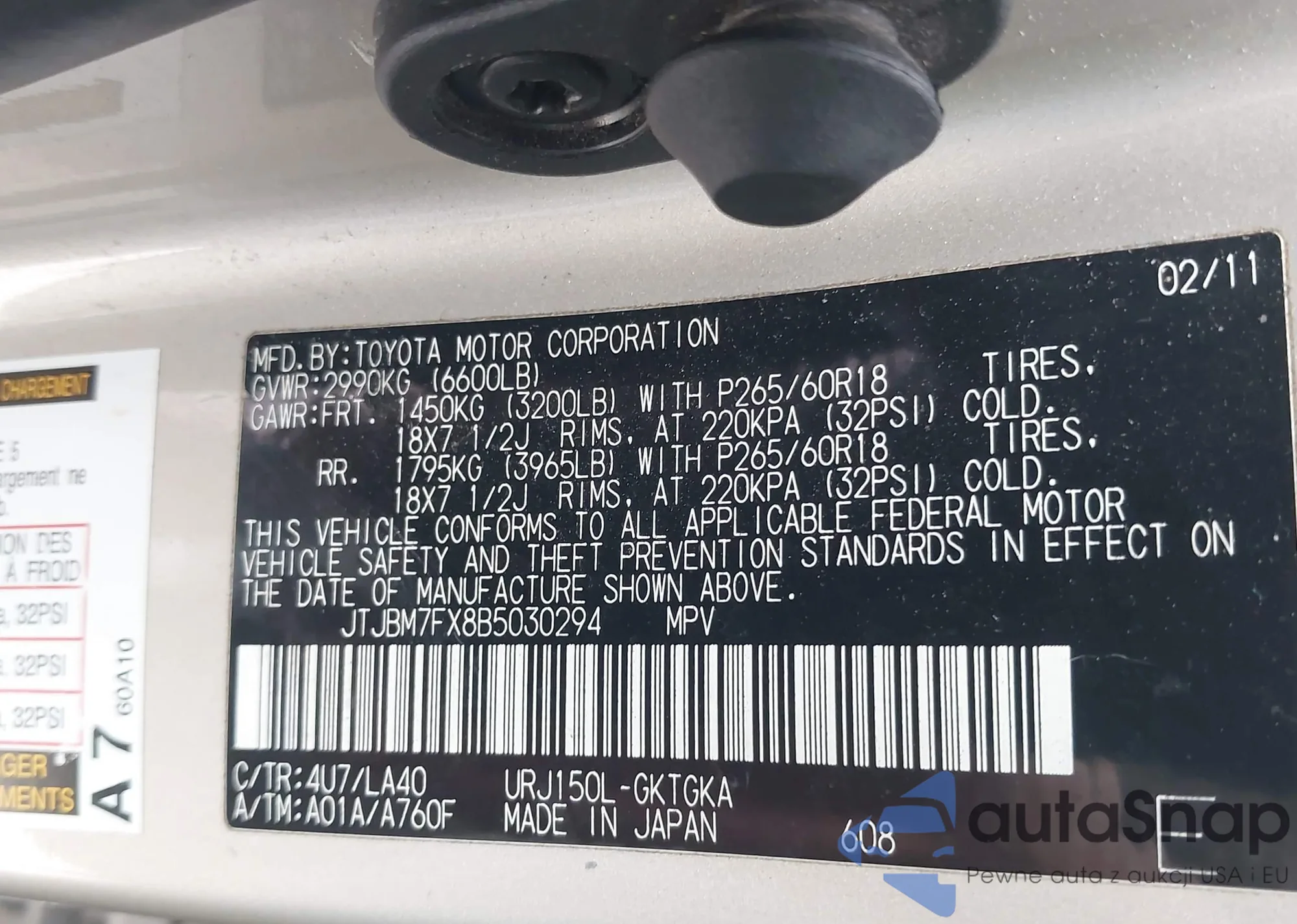 LOT: 40000760 VIN: JTJBM7FX8B5030294