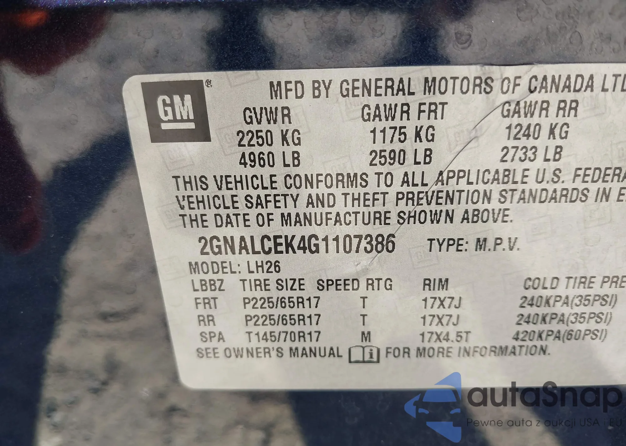 LOT: 42044332 VIN: 2GNALCEK4G1107386