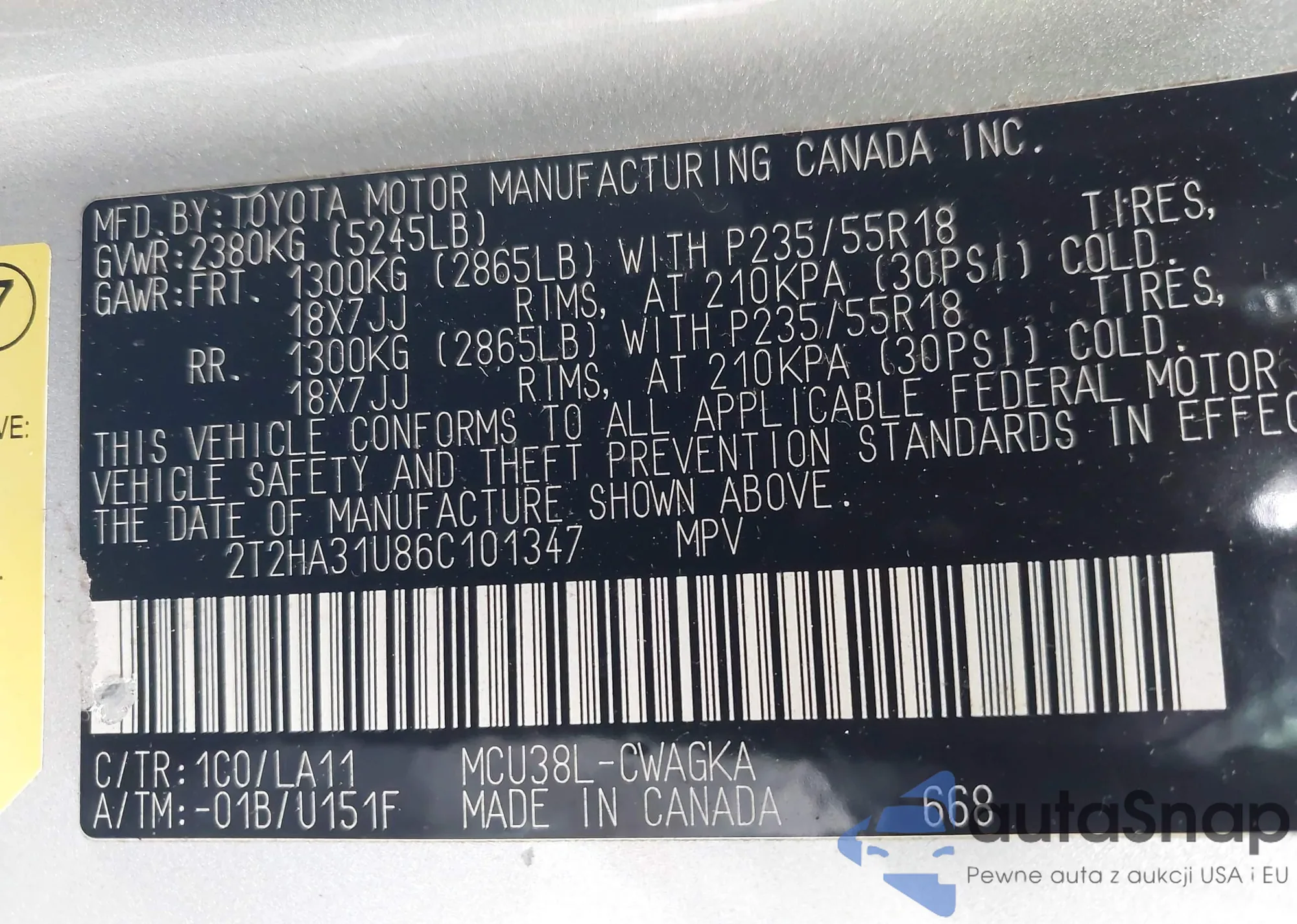 • VIN 2T2HA31U86C101347