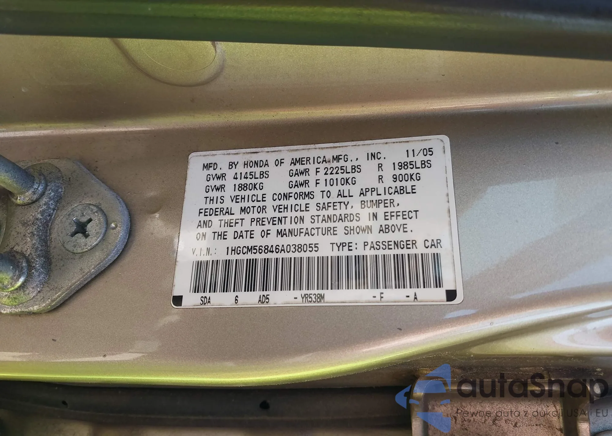 LOT: 42054400 VIN: 1HGCM56846A038055