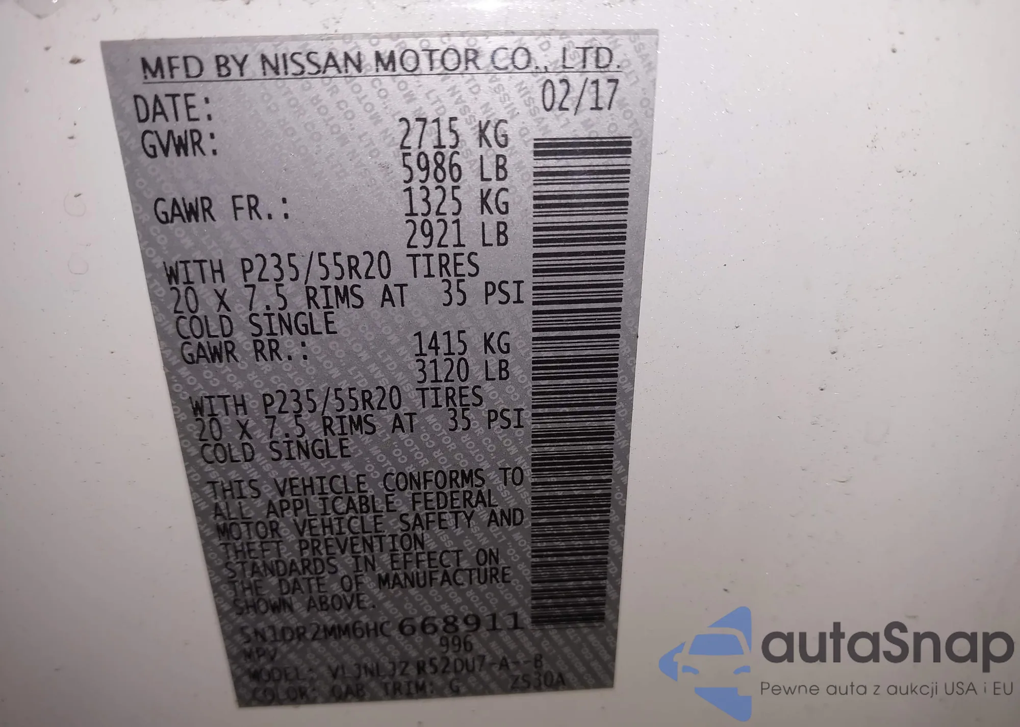 • VIN 5N1DR2MM6HC668911