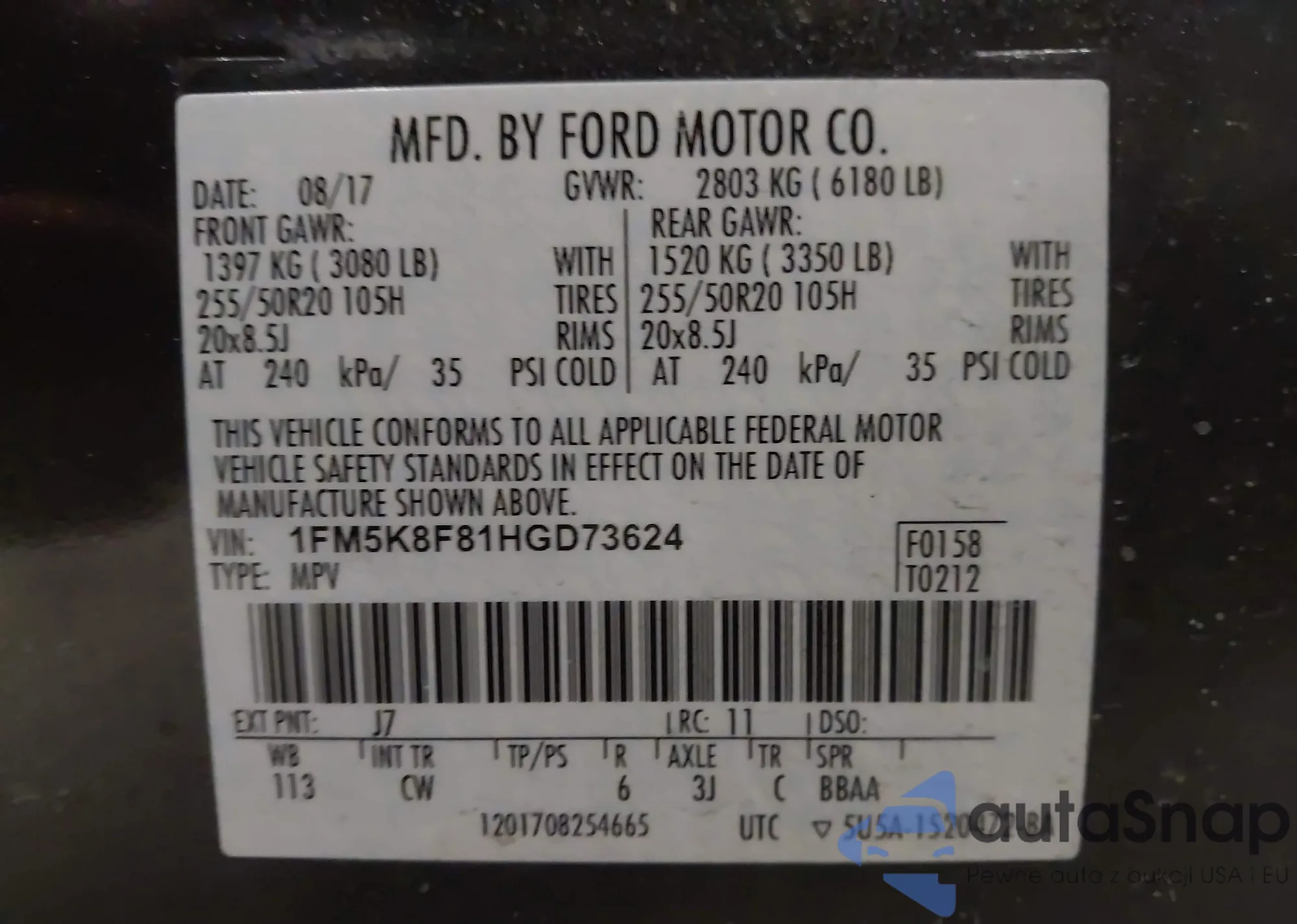 • VIN 1FM5K8F81HGD73624
