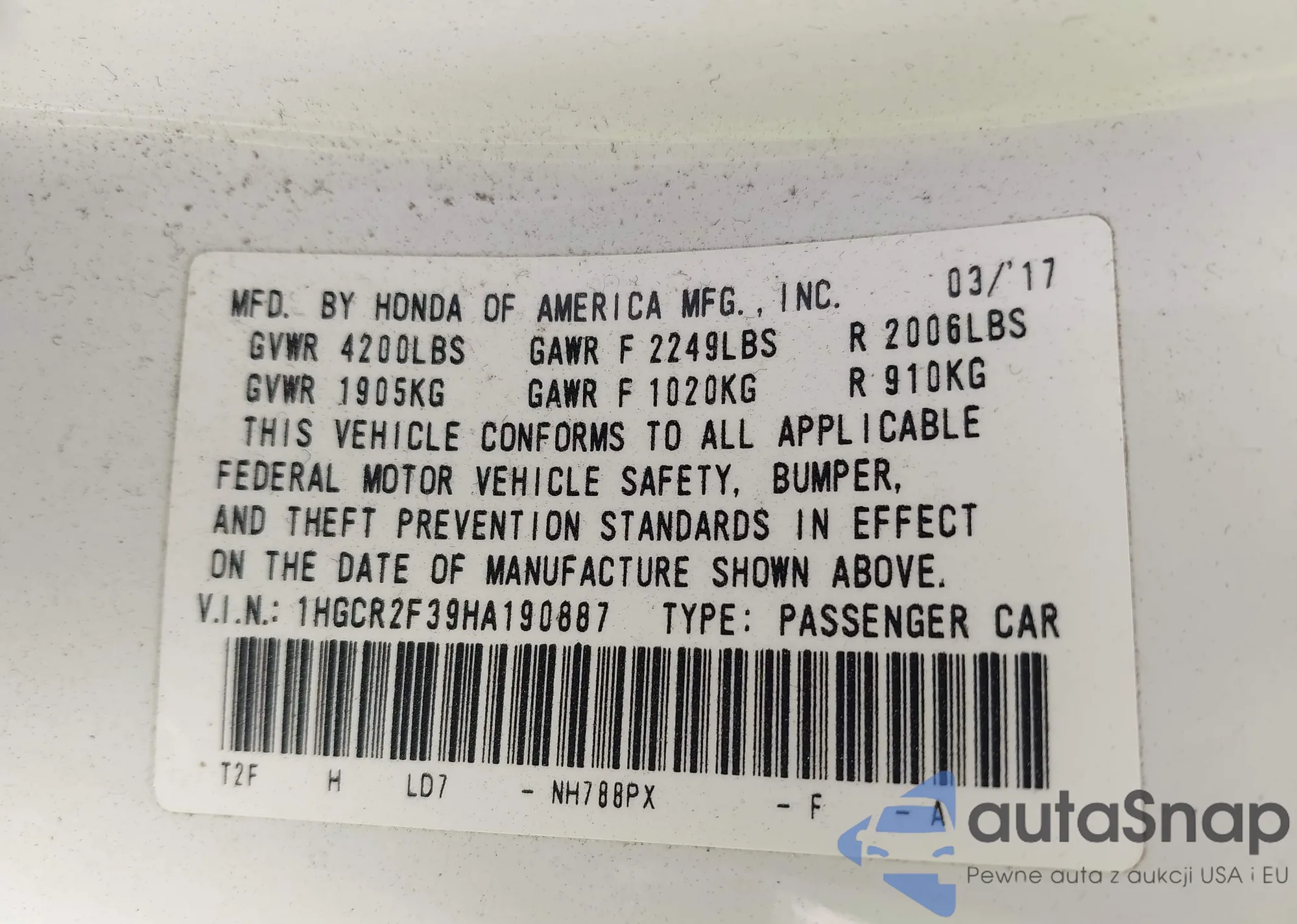 • VIN 1HGCR2F39HA190887