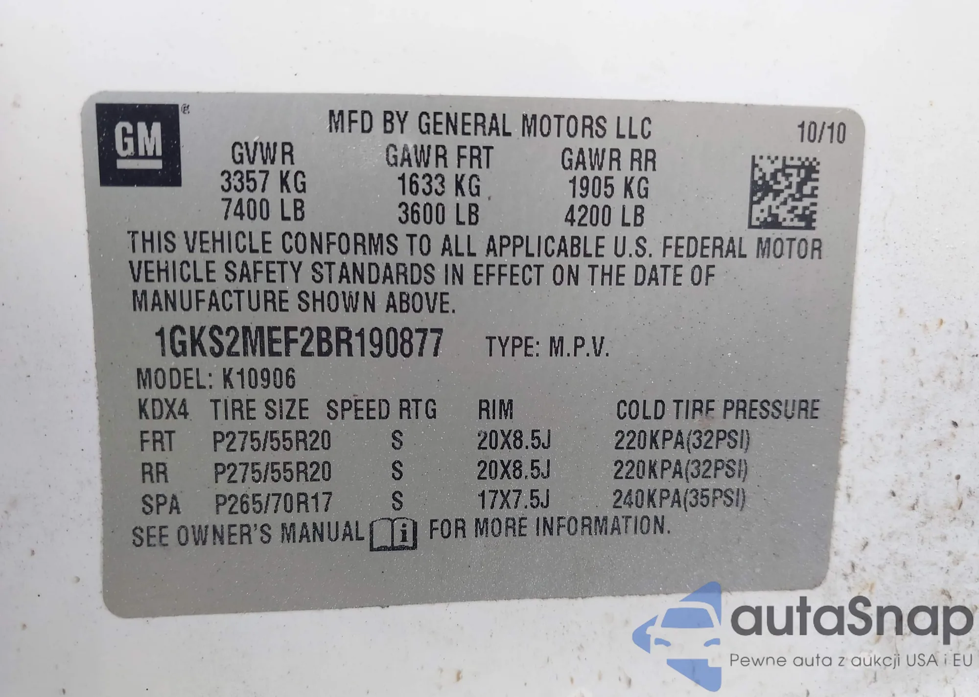 LOT: 42364202 VIN: 1GKS2MEF2BR190877