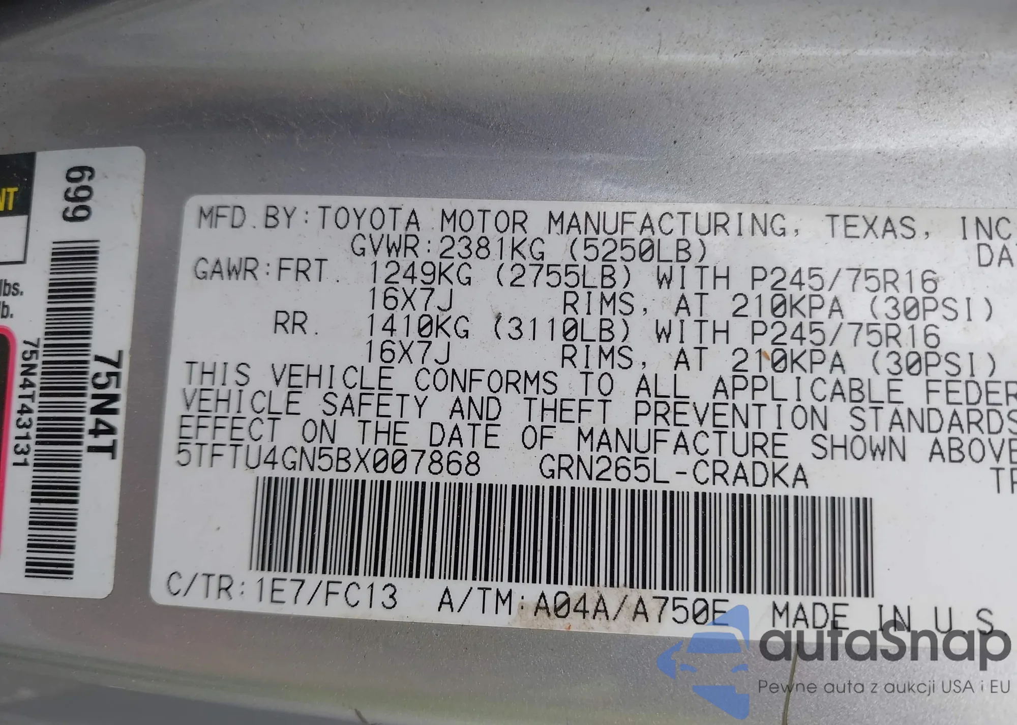 • VIN 3FAHP0JA4BR224905