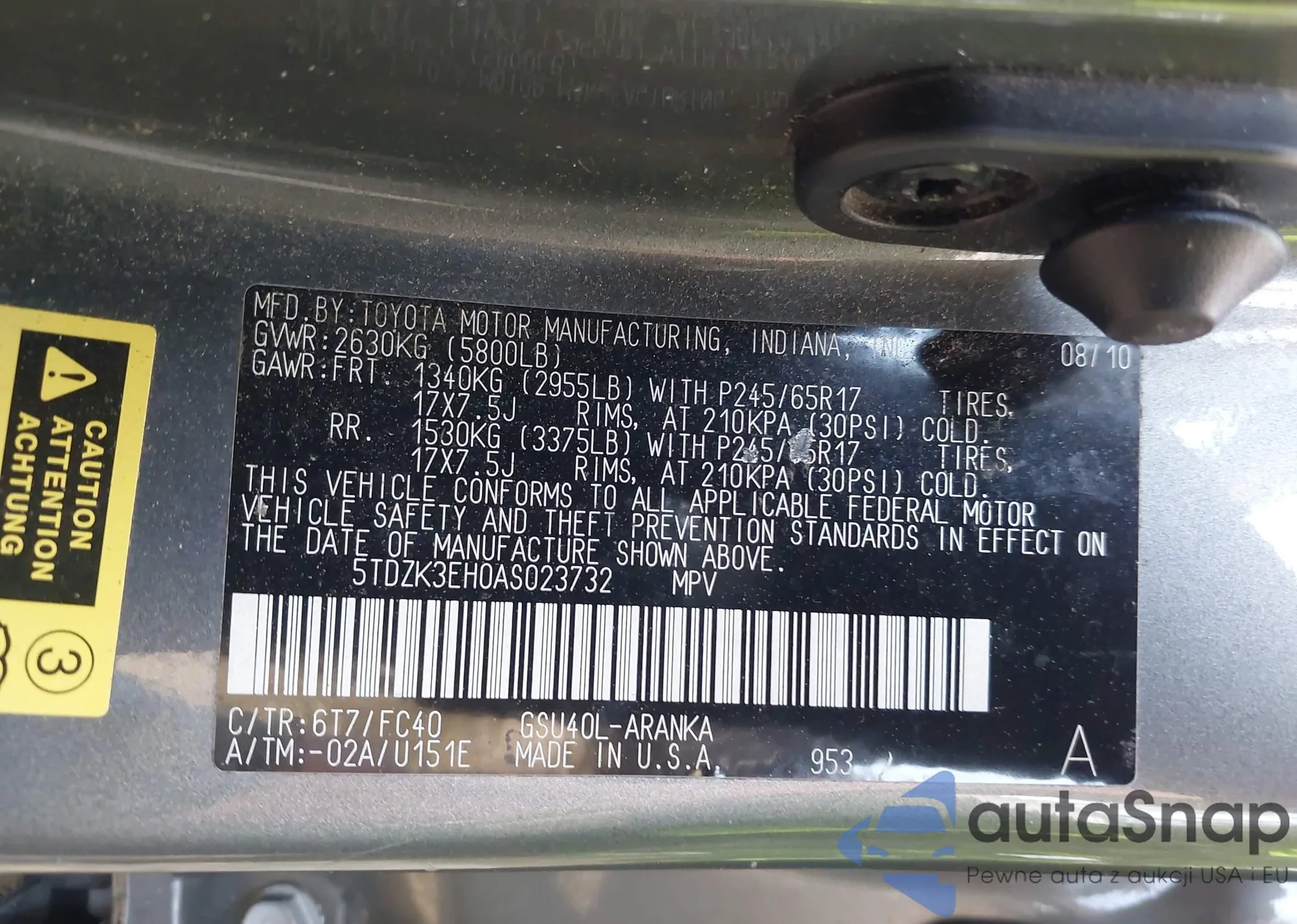 LOT: 42314255 VIN: 5TDZK3EH0AS023732