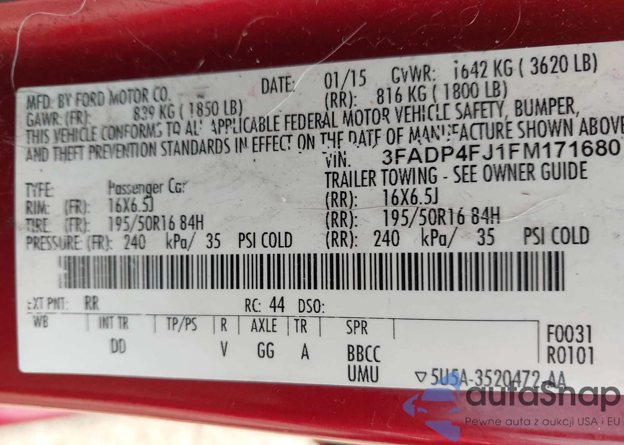 LOT: 42383105 VIN: 3FADP4FJ1FM171680