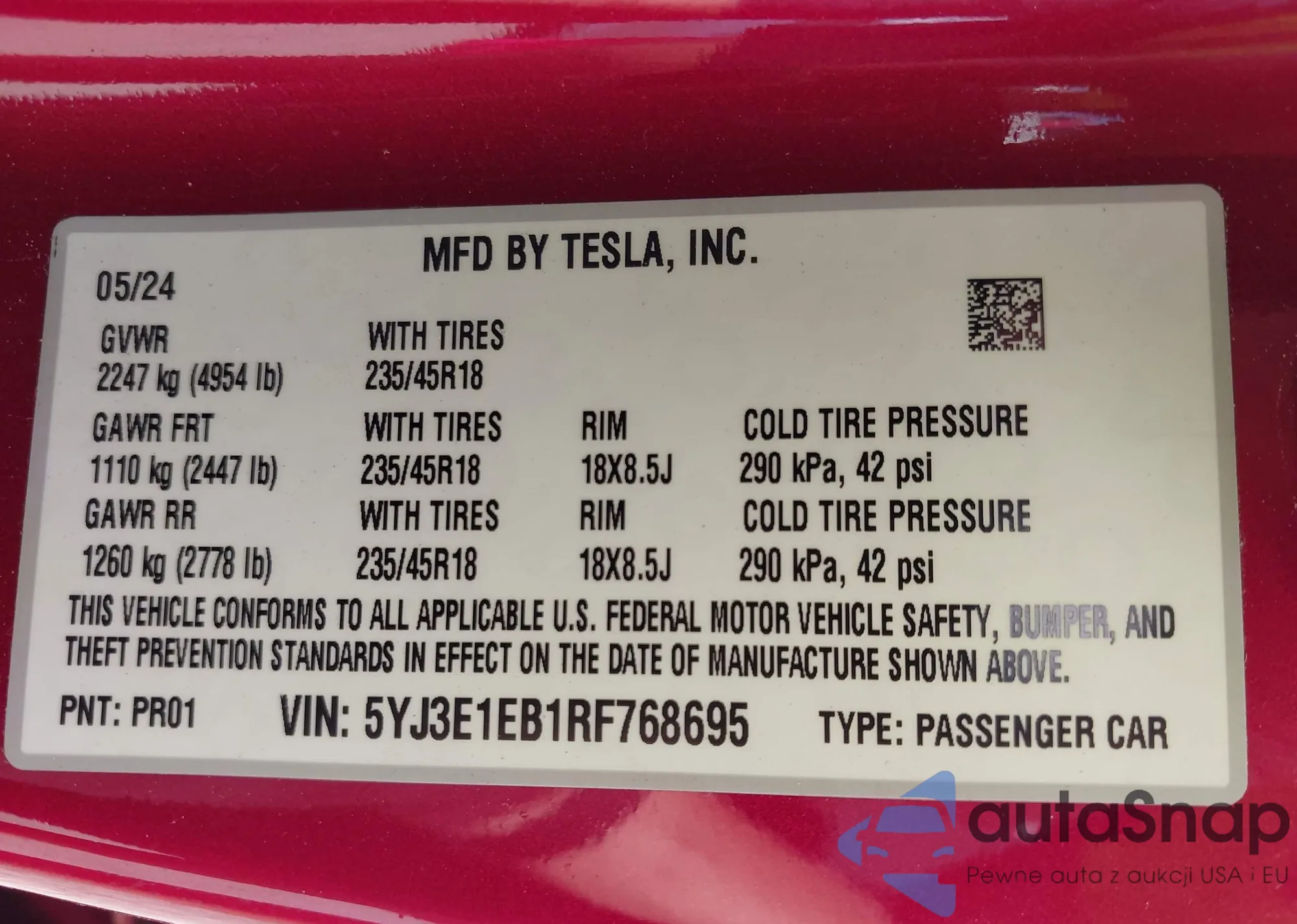 • VIN 5YJ3E1EB1RF768695