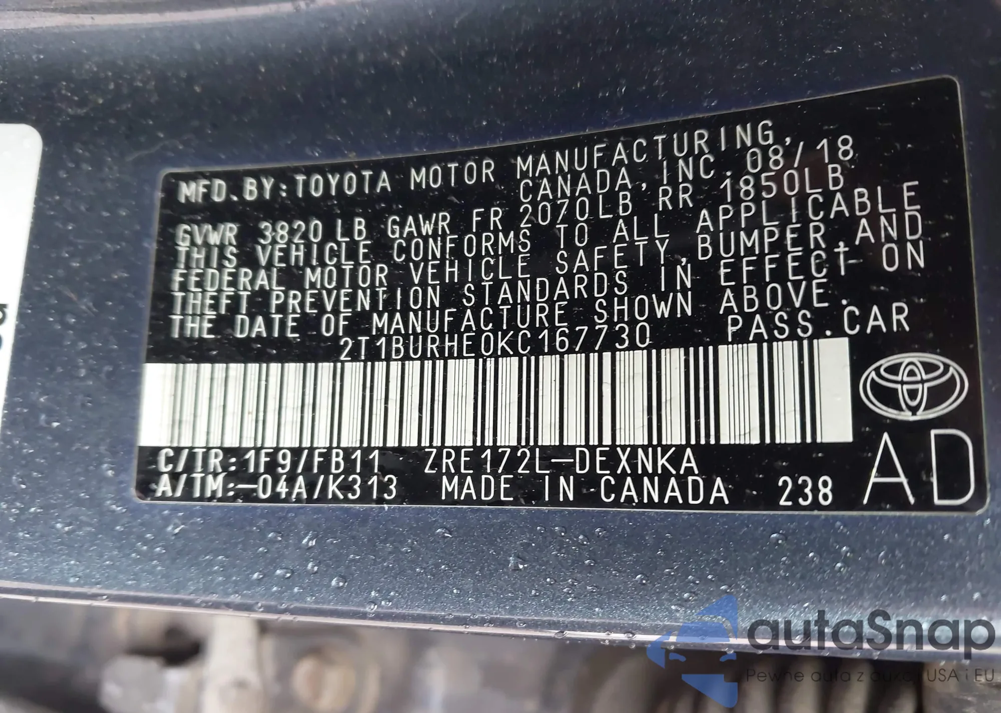 LOT: 42335994 VIN: 2T1BURHE0KC167730