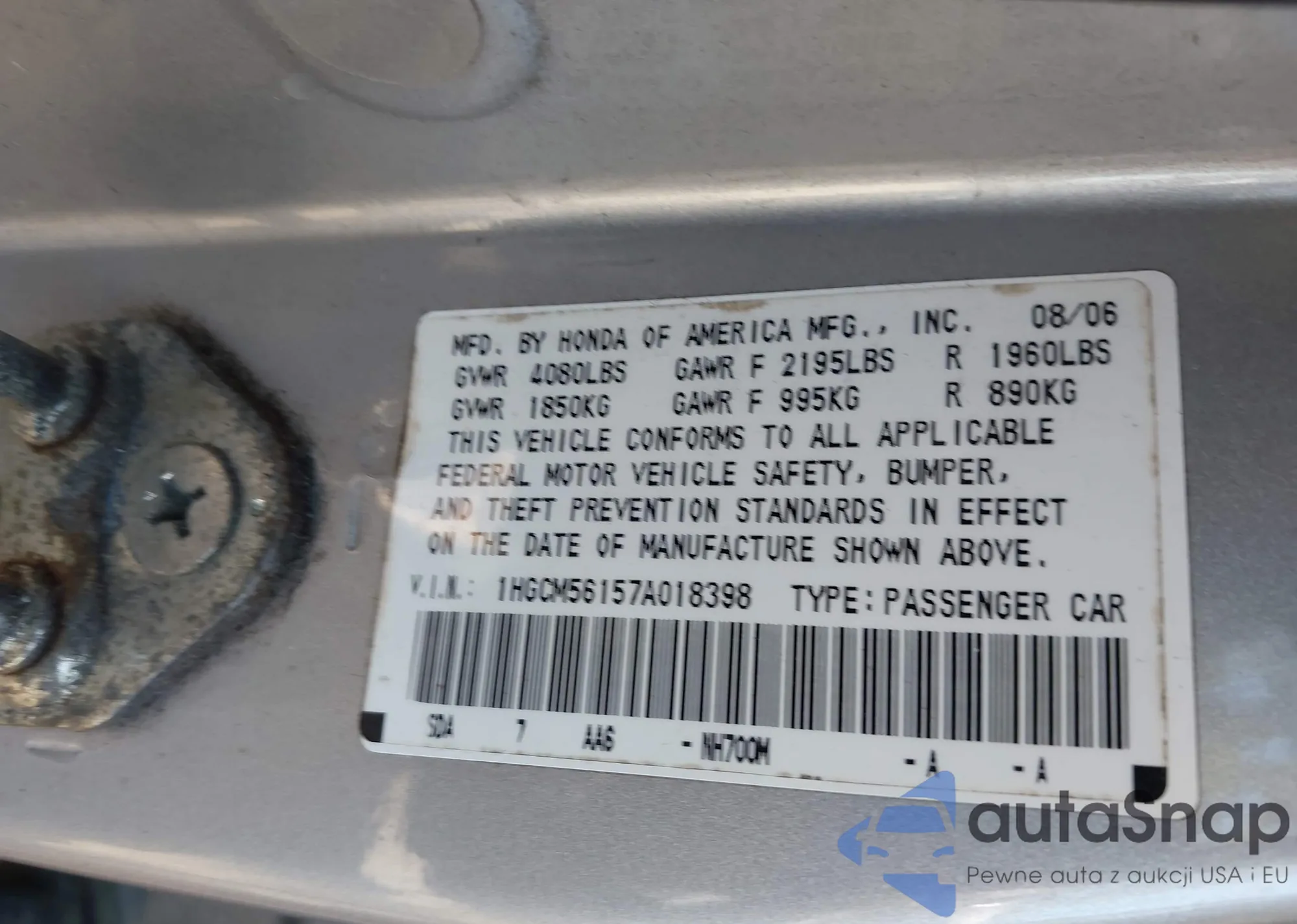 LOT: 42116738 VIN: 1HGCM56157A018398