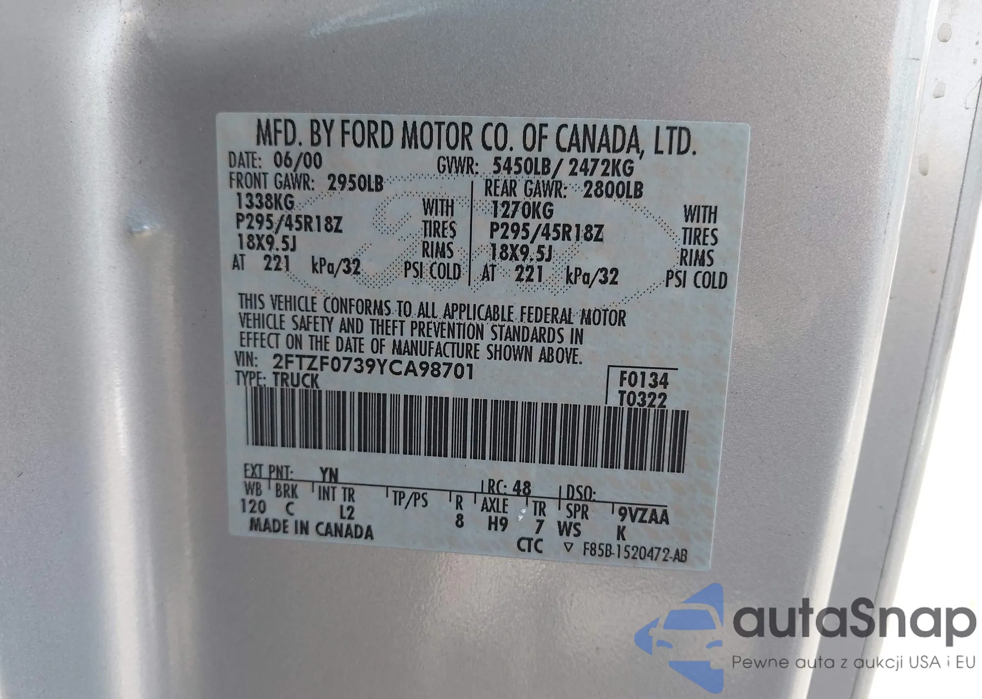 LOT: 42463825 VIN: 2FTZF0739YCA98701