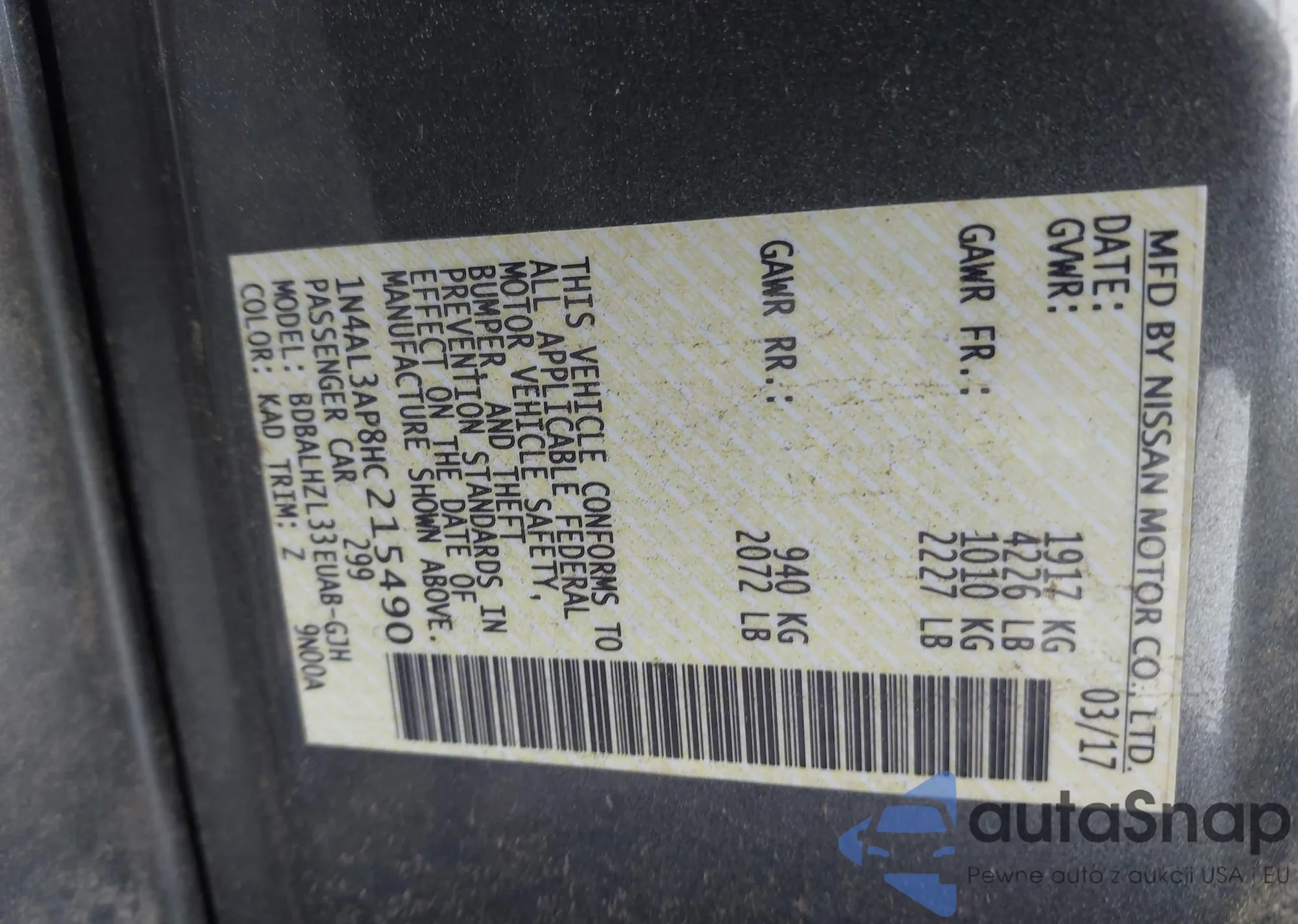 • VIN 1N4AL3AP8HC215490
