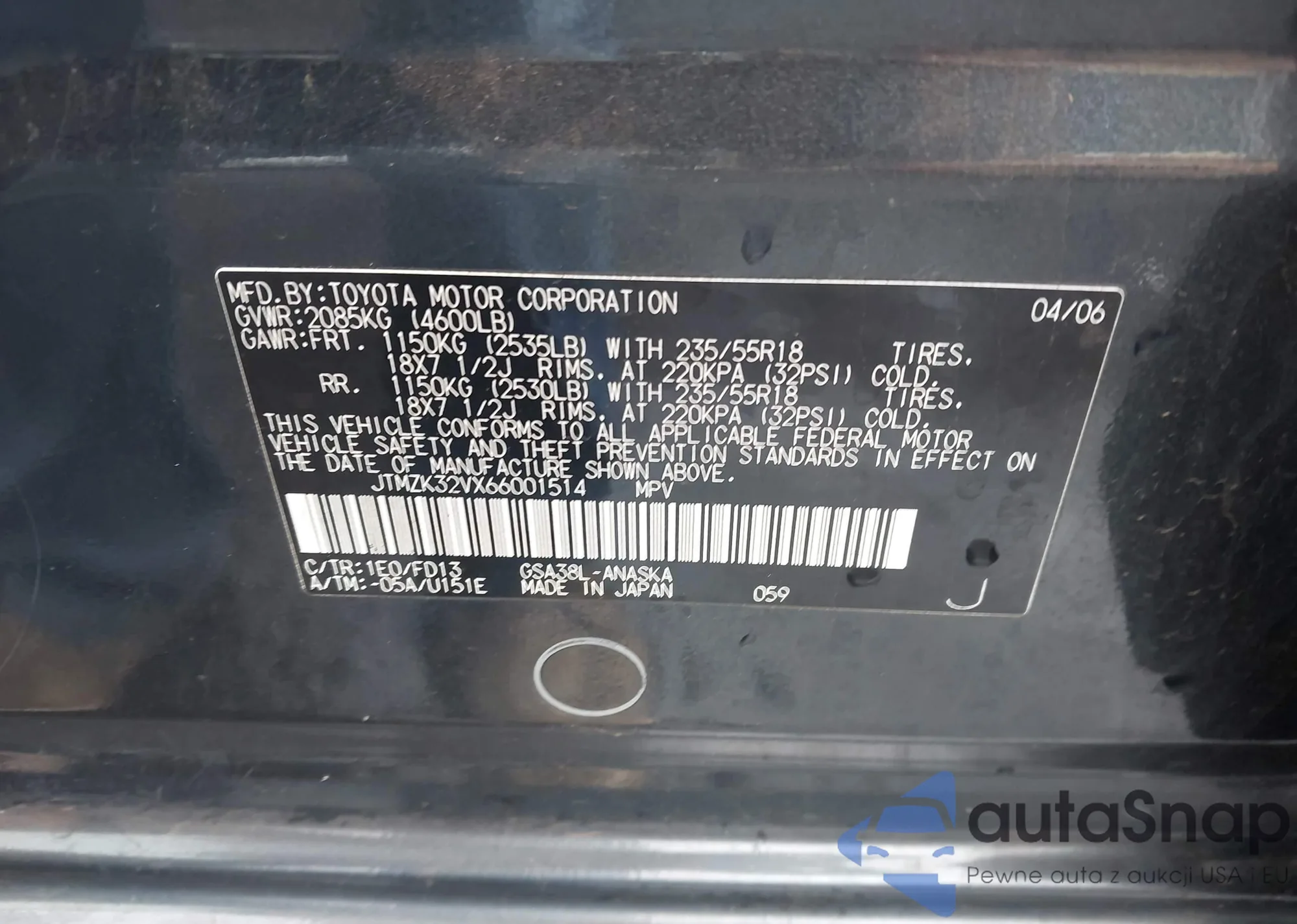 LOT: 42065005 VIN: JTMZK32VX66001514