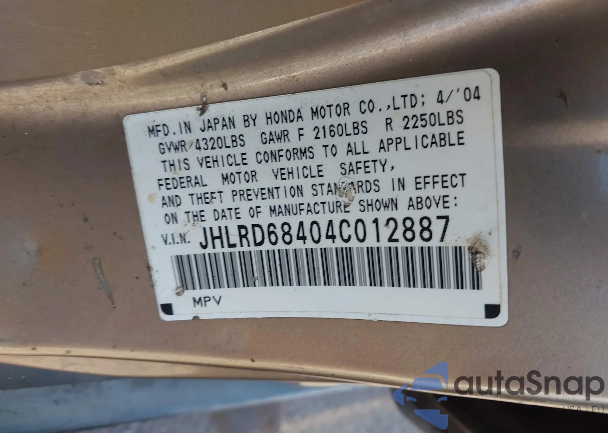 LOT: 42227734 VIN: 2HKYF18154H582903