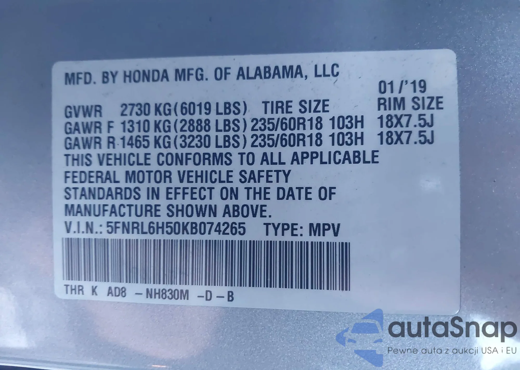 • VIN 5FNRL6H50KB074265