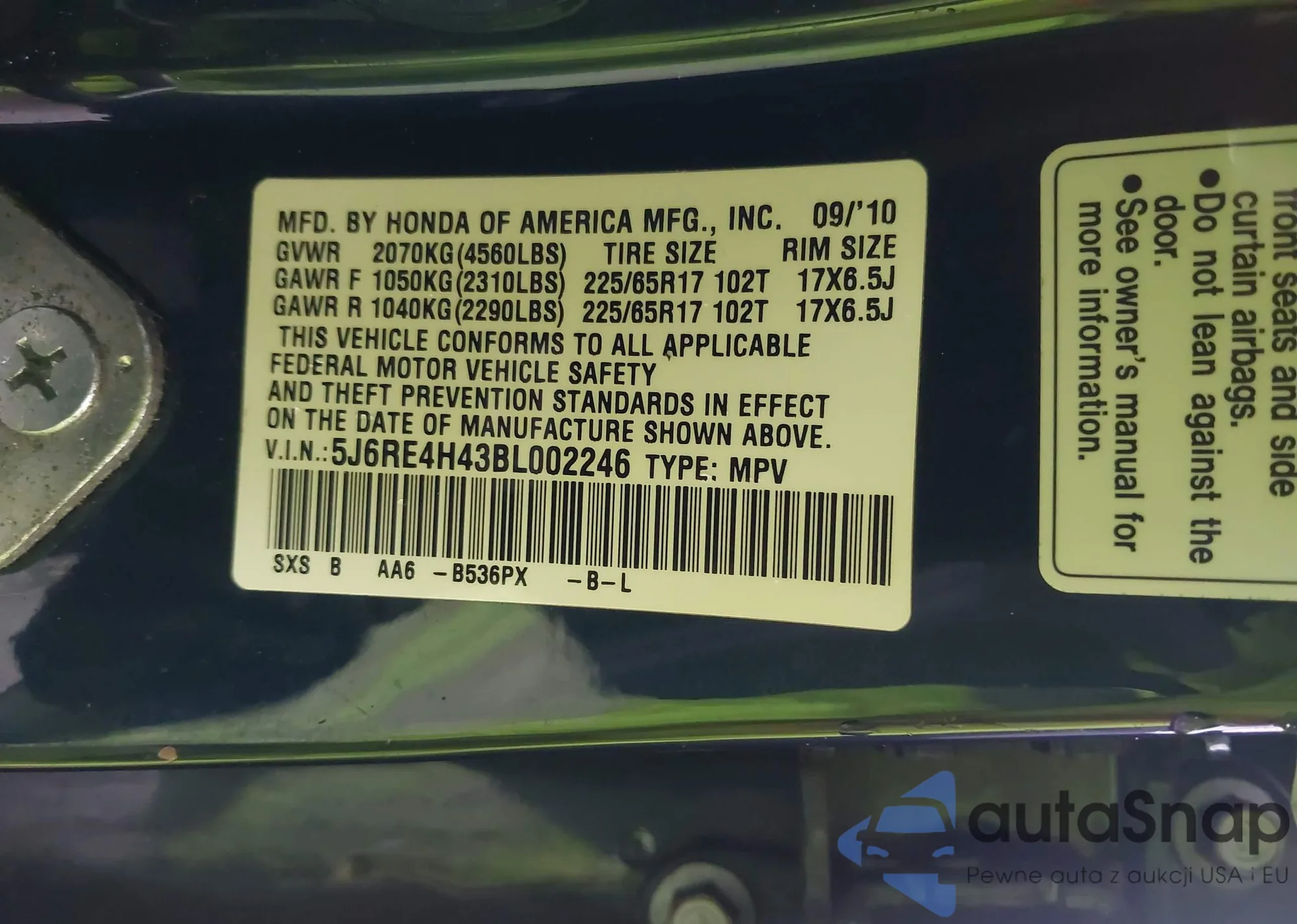 • VIN 5J6RE4H43BL002246