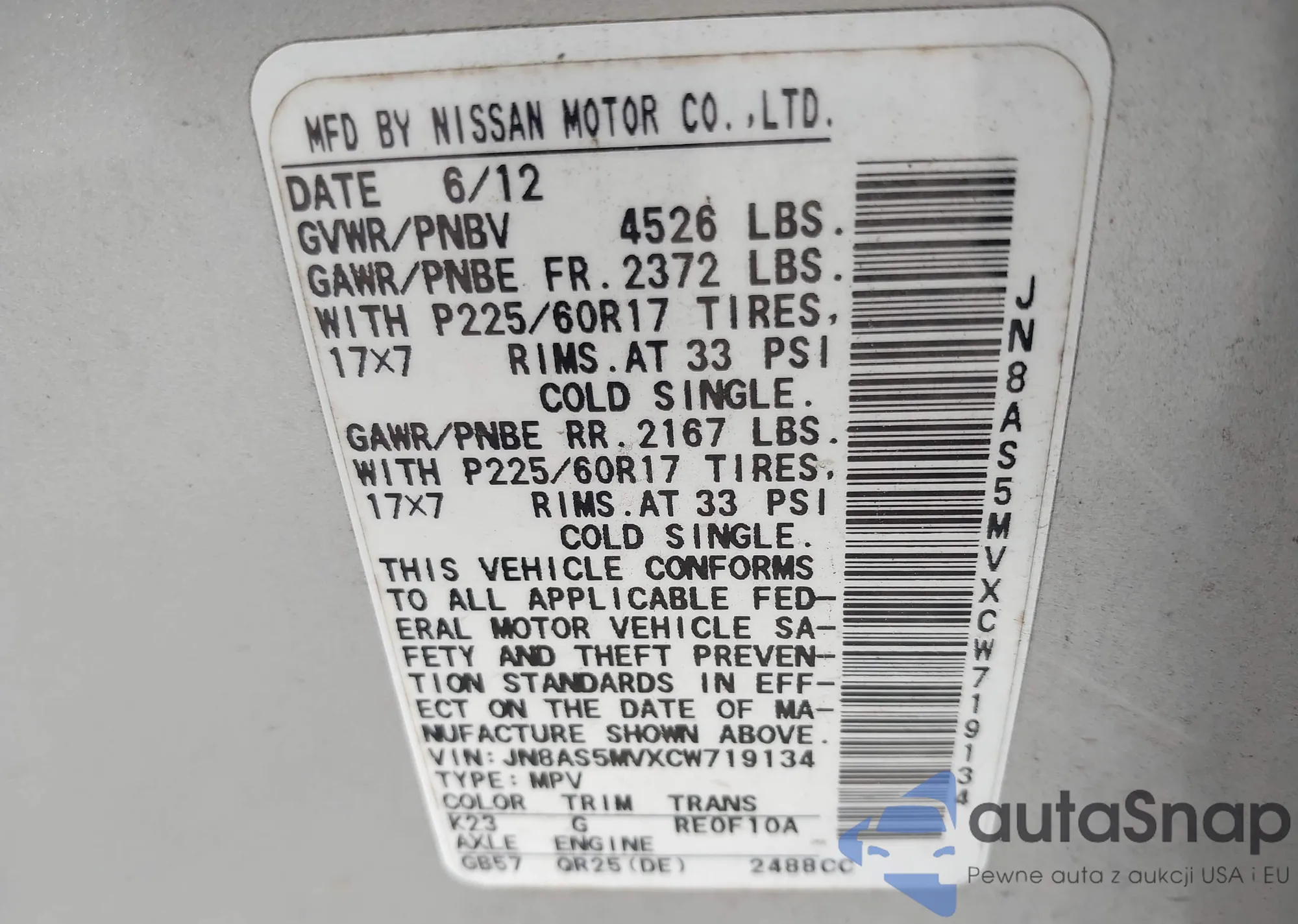 LOT: 42324229 VIN: JN8AS5MVXCW719134