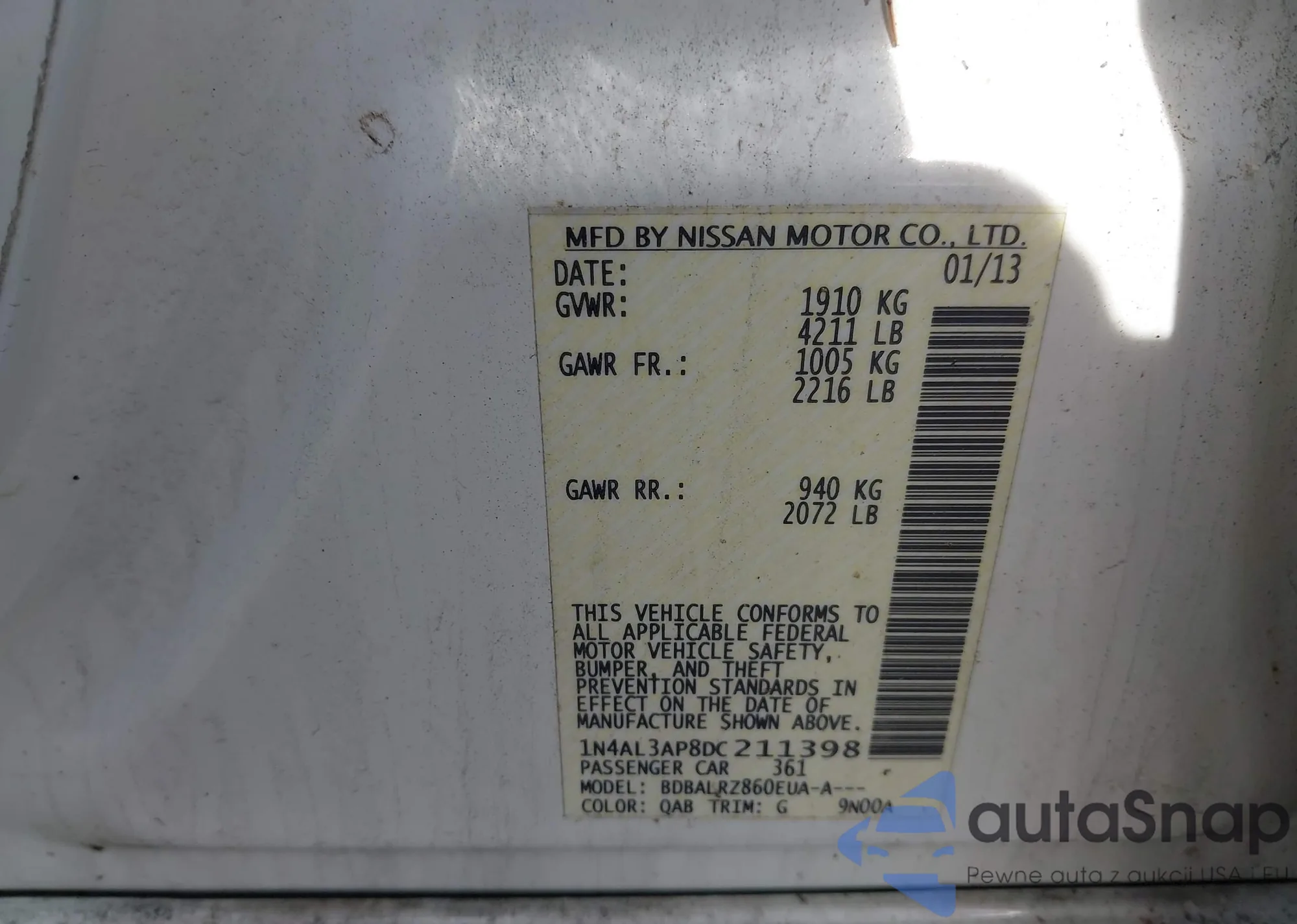 LOT: 42310393 VIN: 1N4AL3AP8DC211398