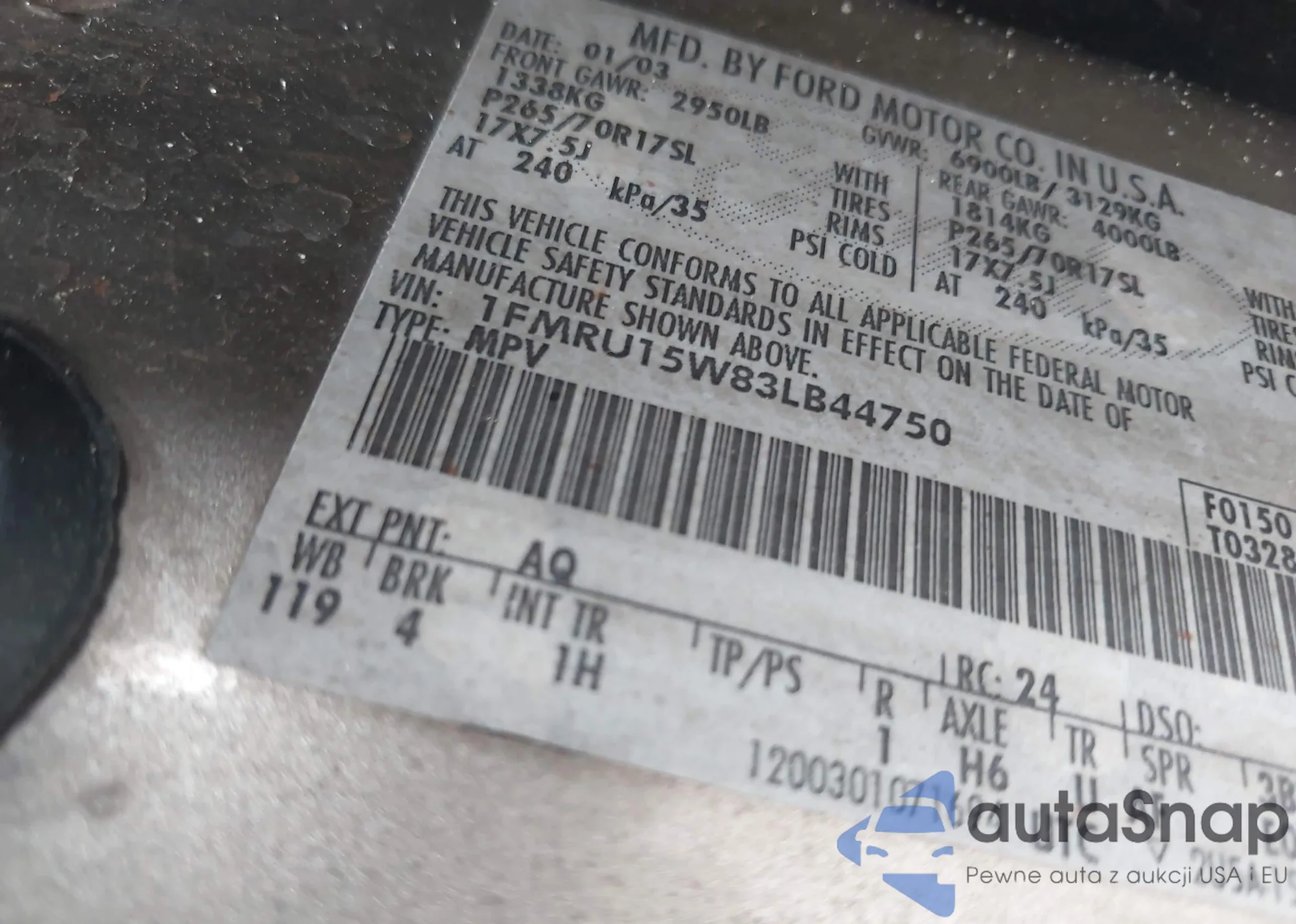 LOT: 42350428 VIN: 1FMRU15W83LB44750